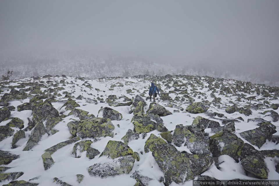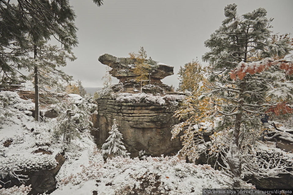 05.Утром вылезли из палатки и оказались в зиме. Всего-то середина сентября, а уже выпал снег. Урал суров, все может быть. Пока снег не растаял, побежали в Каменный город снимать. Это необычный городок с улицами, переулками и домами на высоте 526 метров. Можно ходить по нижнему ярусу или ползать по крышам.