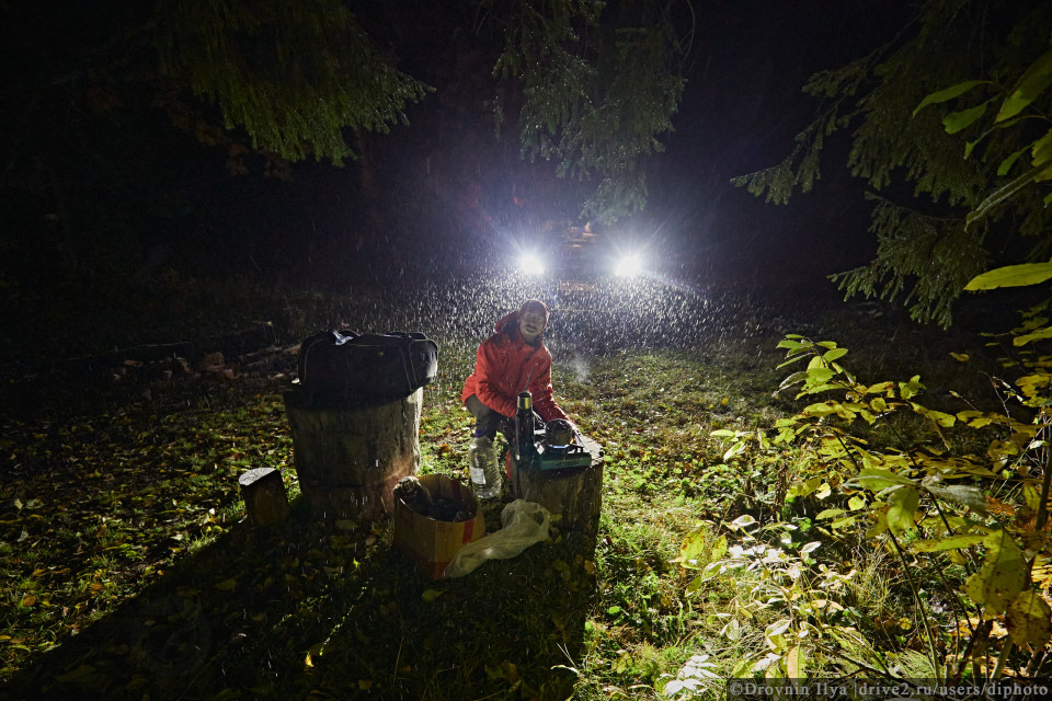 04.Осенью темнеет рано, так что в Перми мы видели только огоньки на кольцевой, а дальше снова темнота и дождь. У Чусового борткомпьютер сказал, что +3, возможен гололед. Вскоре пошел мокрый снег. Прекрасно, значит, утром может быть красиво. Приехали уже поздно, приготовили гречку, упали спать.