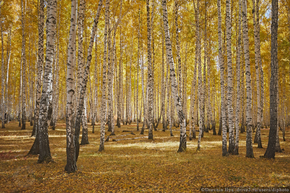 Осенний сибирский лес, много цветов, контрастный свет, освещенная часть ландшафта, контрастный эффект