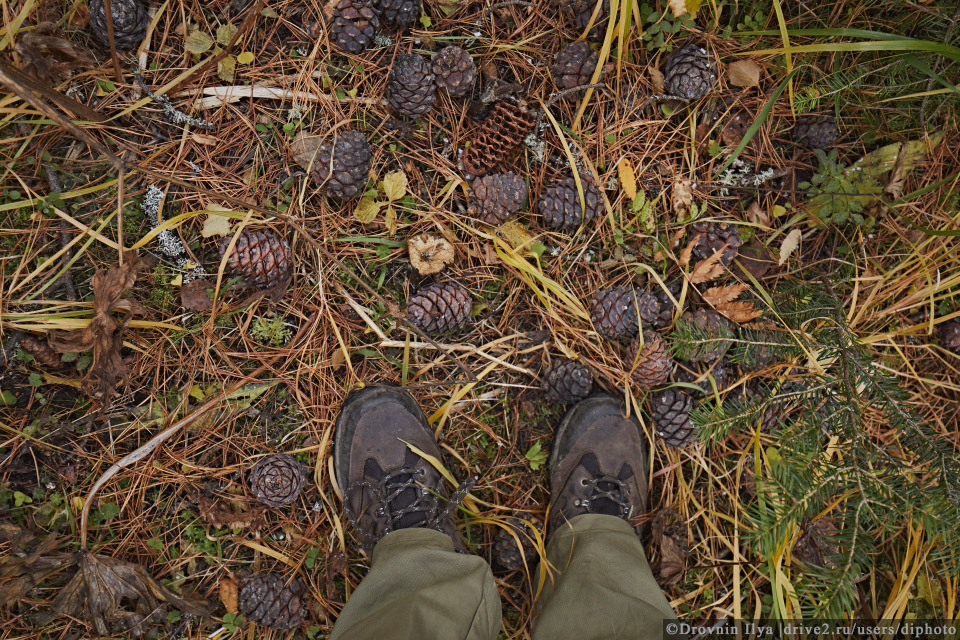 21.Поискав в округе, нашли настоящий шишечный клондайк. Насобирали полтора мешка. Можно и больше, только на себе много не унесешь. Благо, походный рюкзак на 100л, который взяли под термос с бутерами был пуст. Притащили 40 кг.