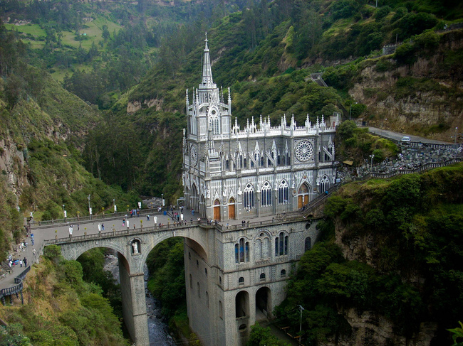 Католический собор Las Lajas расположен в департаменте Нариньо, Колумбия, и является одним из самых посещаемых соборов страны не только церковными прихожанами, но и многочисленными туристами. Церковь построена непосредственно на мосту над рекой Гуаитара. Строительство собора датируется 1916-1949 годами, а основной архитектурный стиль постройки - неоготический. С постройкой собора связана красивая легенда: здесь находилась пещера, пользовавшаяся у местного населения недоброй славой. Однажды через нее проходили мать с глухонемой дочкой, и произошло чудо: Богородица исцелила больную девочку, а ее мать Мария в знак благодарности нарисовала на стенах пещеры прекрасный портрет Богоматери. К слову, эксперты до сих пор не могут определить, что же за краска нанесена на стены храма. Единственное, что можно было выяснить - это то, что камни пропитаны краской насквозь.