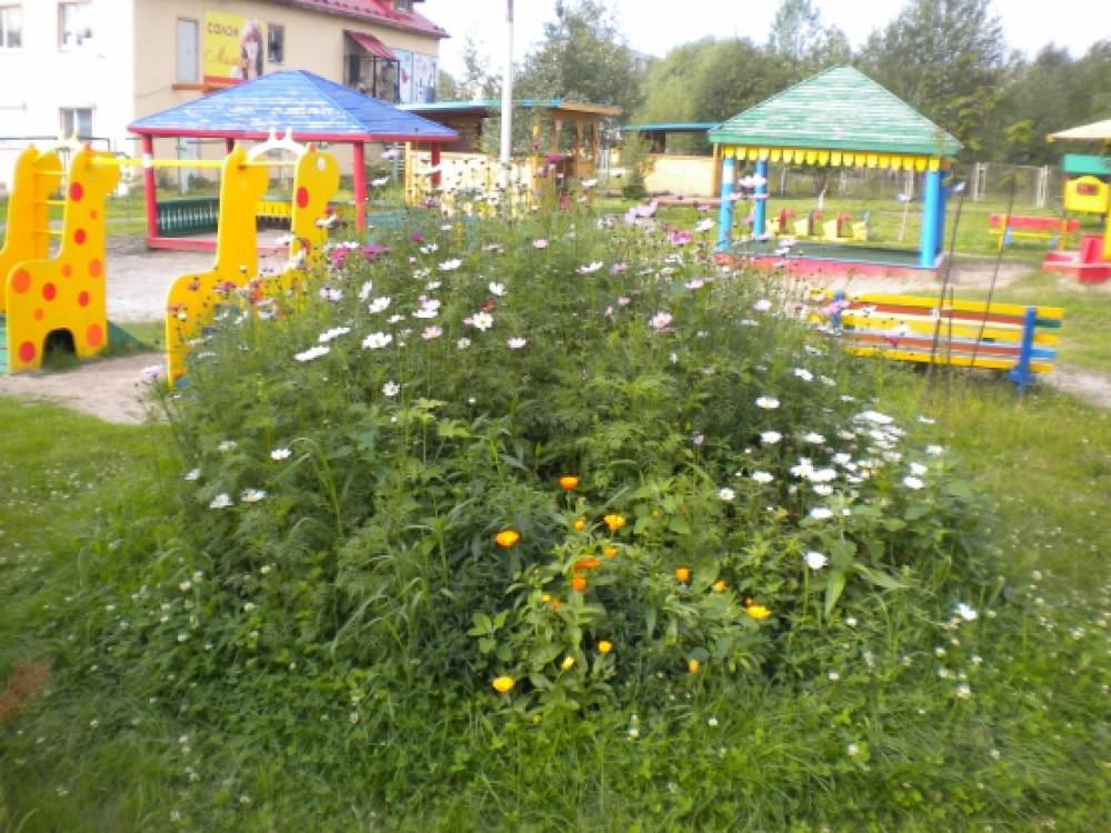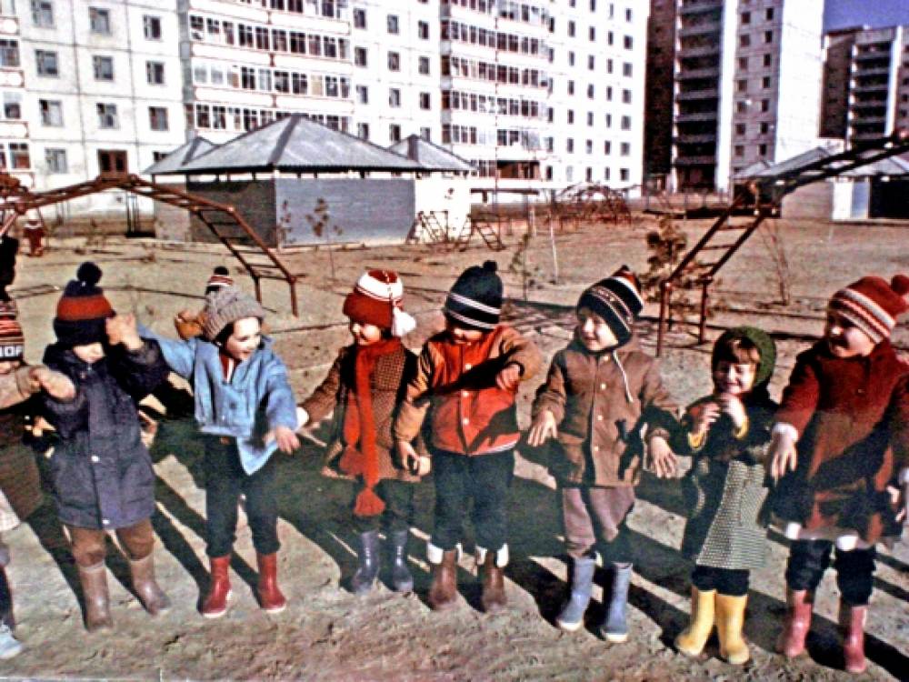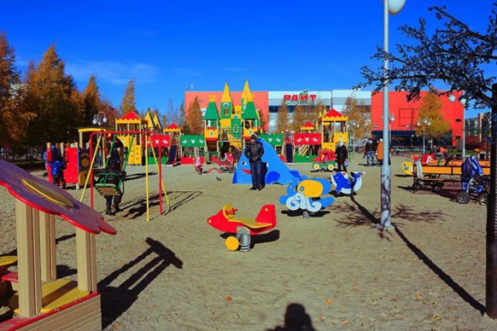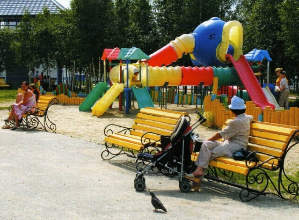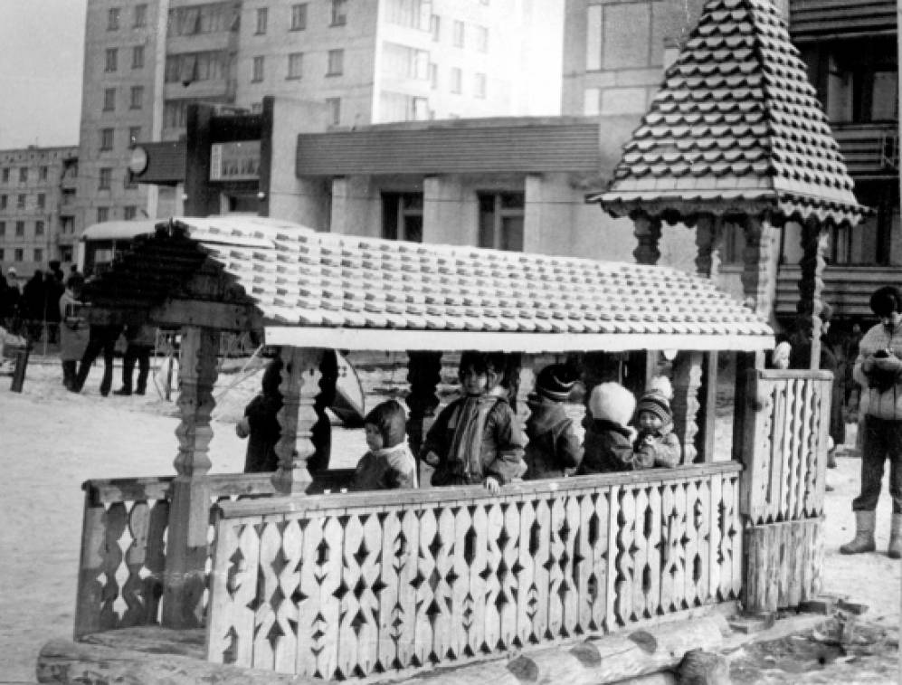 Первый детский городок в первом микрорайоне был построен в тысяча девятьсот восемьдесят седьмом году. Это были бревенчатые постройки в виде башен, резных беседок, деревянных горок.
