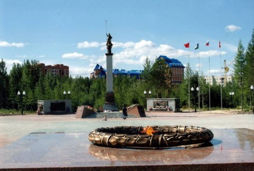 Перед площадью, где стоит бронзовая статуя Георгия Победоносца, есть вечный огонь. Рядом с вечным огнём на мраморных плитах написаны имена погибших героев из Нягани, изображены ордена. Особенно красиво на площади летом, много зелени и цветов.