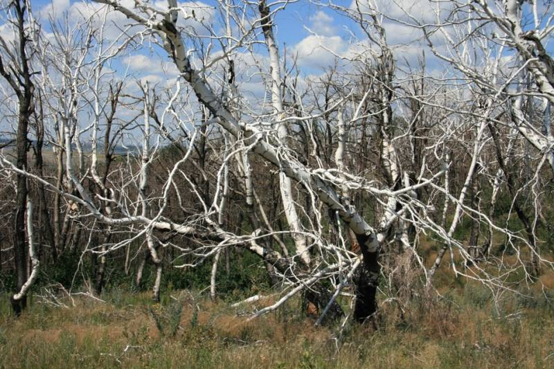 Многие деревья основательно обожжены. Большинство — в нижней части ствола, но у некоторых растений выжжена вся сердцевина, в отдельных случаях от массивного дерева оставался лишь обугленный пенёк.