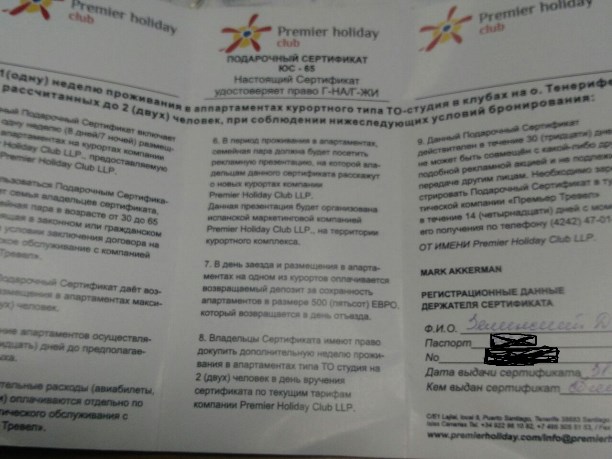 Через некоторое время мне позвонили и пригласили на "вручение призов". У меня раньше был опыт посещения разводиловки под названием "презентация таймшера", но в тот момент я подумал "а вдруг что-то приличное. " И мы с женой пошли. Как только попали в помещение этой компании, меня посетило ощущение горького Дежа-Вю. Все то же самое, что было 5 лет назад : все те же потуги на "шик": охрана, евроремонт, суетливые менеджеры, обилие видеоаппаратуры и прочие атрибуты, призванные убедить "буратин" в том, что все надежно и верно. Мы сели за стол. Подбежал менеджер. мы с женой сразу сказали ему, что мы все знаем, проходили, нас не развести и вообще мы уходим. Он сильно опешил от нашего напора и буквально упросил остаться (видимо в противном случае его лишили бы премии а то и вовсе выгнали), Мы остались. Парили нам мозги 2,5 часа. Но с тех пор, когда я, тогда еще "совок" раскрыв глаза и уши внимал рассказам о неземном рае, прошли. Мир изменился и мы изменились. Вот только методы оболванивания остались прежние. Я ожидал, что мы уйдем отсюда с чувством глубокой досады за бесцельно проведенное время, как вдруг нам достался купон "На предоставление туристических услуг в размере 20000 рублей". Мы подумали "почему бы нет ! " и взяли его. По условиям мы оплачиваем только дорогу, а трансферт и проживание нам дарят, но с условием , что мы посетим презентацию на месте.