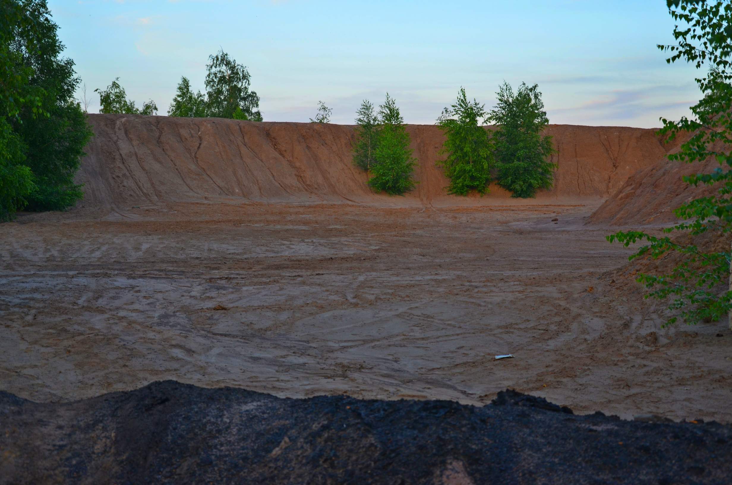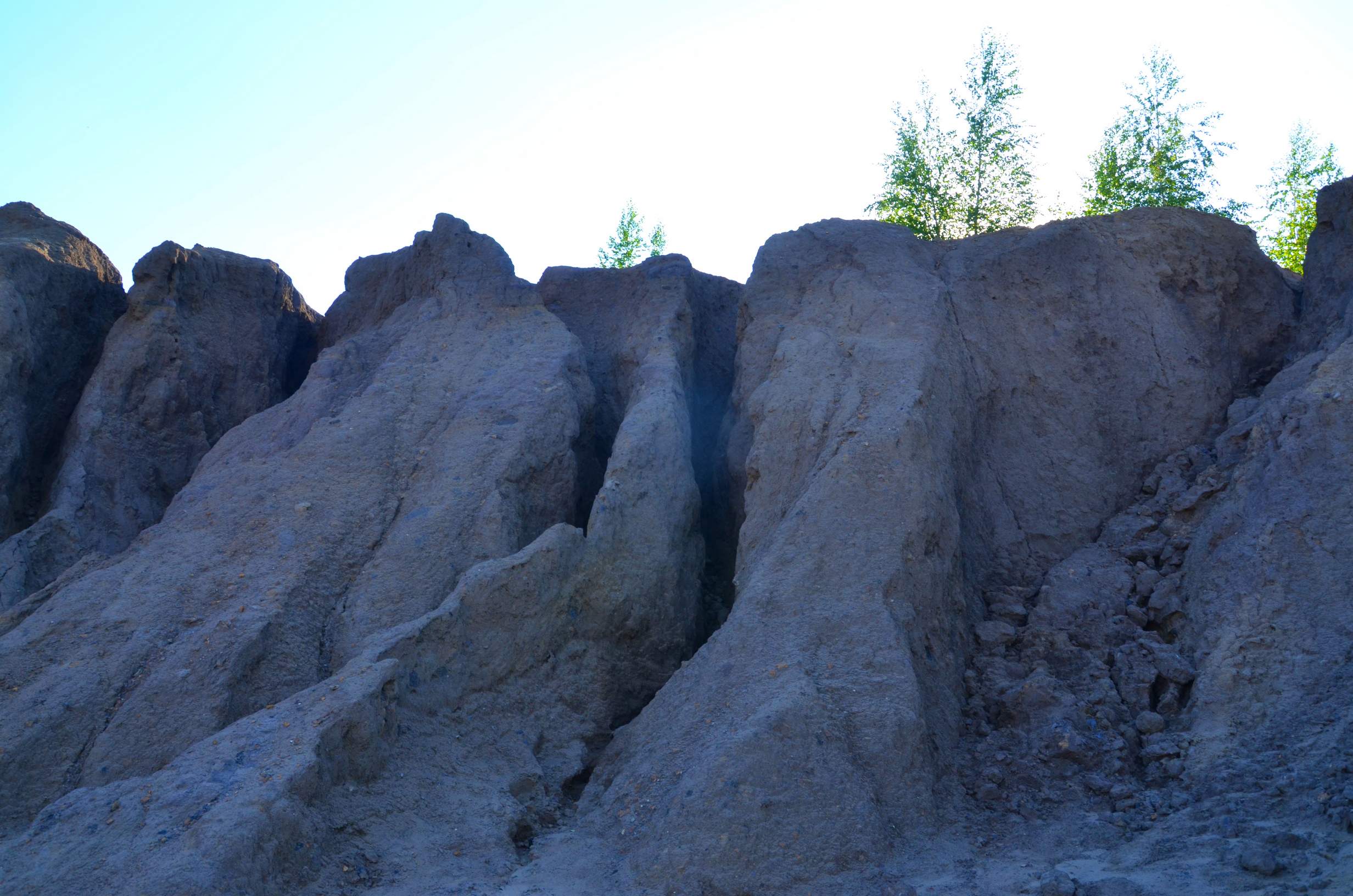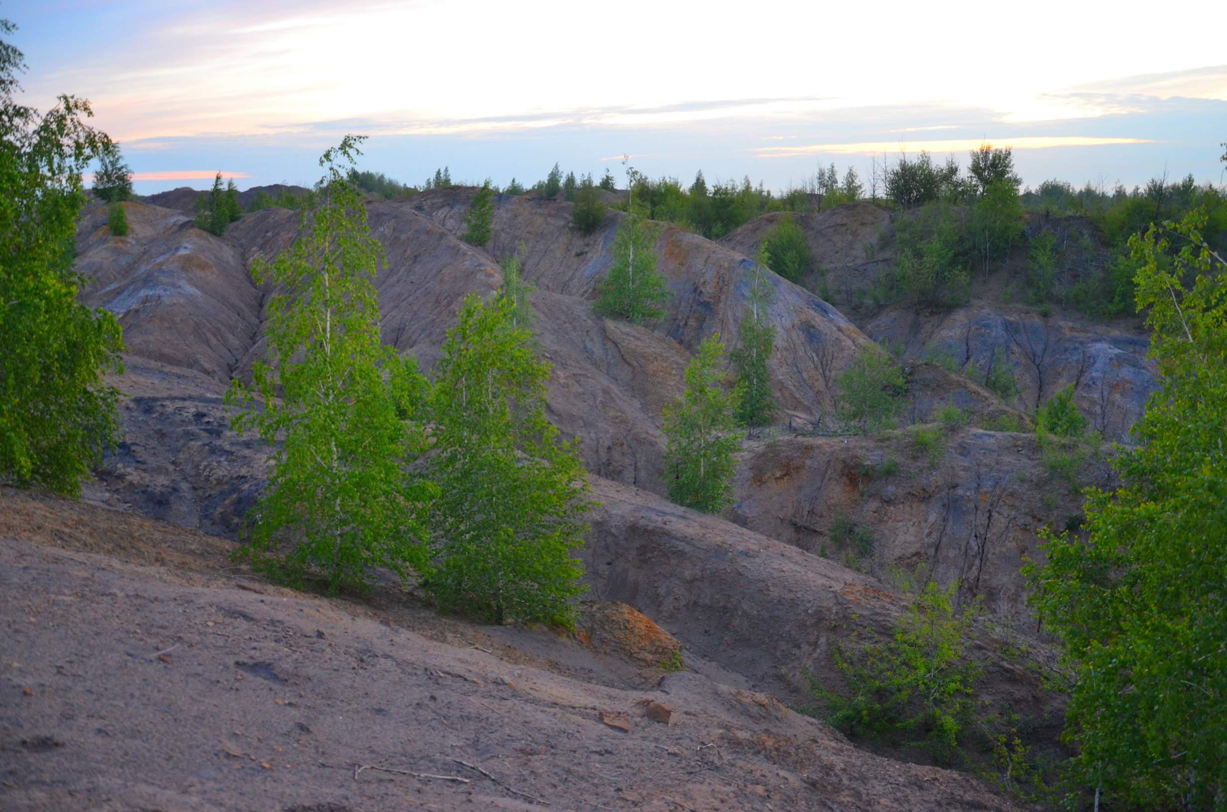 Итак, мы выбрали по нашим разведданным самую красивую часть заброшенного мегакарьера. Обошли её по периметру, преодолевая и обходя сыпучие каньончики-лучи, образующиеся потоками стекающей после дождей воды.