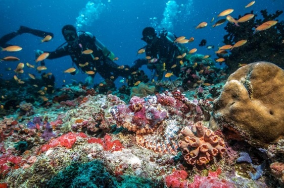 На домашнем рифе Камаду можно встретить несколько видов морских скатов, рифовых акул, мурен, морских черепах и множество ярких коралловых рыбок, среди которых крылатка, рыба-хирург, рыба-ангел, рыба-шар, рыба-попугай и др. А также тут вас ждут осьминоги, морские огурцы, разнообразные морские звезды и множество видов мягких и твердых кораллов и губок.