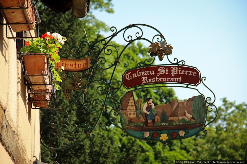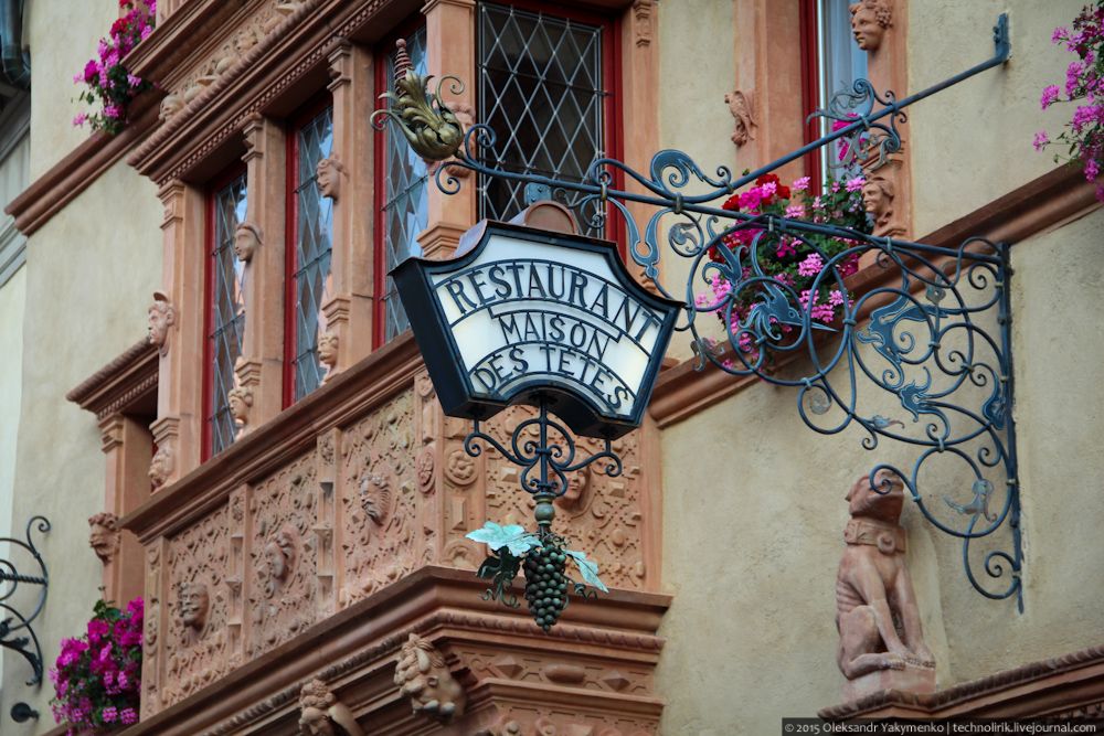 37. На первом этаже Дома голов расположен ресторанчик, о чем указывает красноречивая вывеска на кронштейне, такая же шикарная, как и все в Кольмаре.