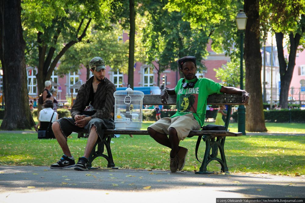 46. Напротив меня на лавочке сидела колоритная парочка парней с канарейкой в клетке. Парни только что подошли в парк, сели на лавочку и тот, что в футболке с Бобом Марли, сразу же закурил интересную сигаретку.