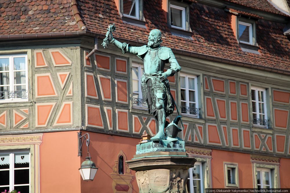 35. Городской фонтан увенчан скульптурой средневекового дипломата, государственного деятеля и генерала Lazarus von Schwendi. В немецкой википедии есть большая статья о нем, но мне было лень ее читать, так что чем он прославился не знаю.