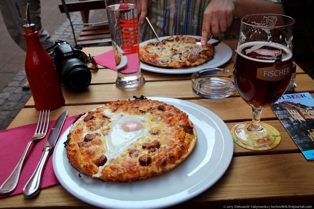 57. Наше путешествие по Эльзасу началось с самого утра, программа была довольно насыщенной и времени перекусить не было. К вечеру голод начал настойчиво напоминать о себе и перед тем, как покинуть этот милый городок, было принято решение подзарядить аккумуляторы. Я заказал пицу с популярной во Франции колбаской Merguez и был приятно удивлен вбитым в центр яйцом. Никогда раньше такого не видел. Пица с местным пивом обошлись в копеечку, Эльзас очень недешев для туриста.