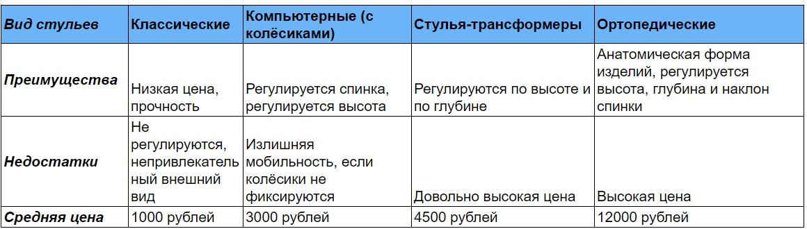 В таблице ниже — лучшие и самые популярные виды стульев для школьников: их плюсы, минусы и средние цены.