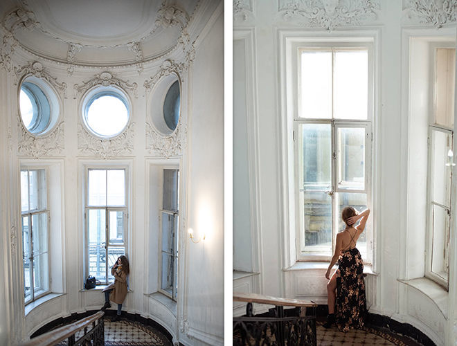 Абсолютно белоснежная парадная с огромными окнами, камином и красивой лестницей. И открытая, к нашему счастью. На таком фоне можно создать невероятной красоты фотосессию: нежную или контрастно яркую, в зависимости от желания.