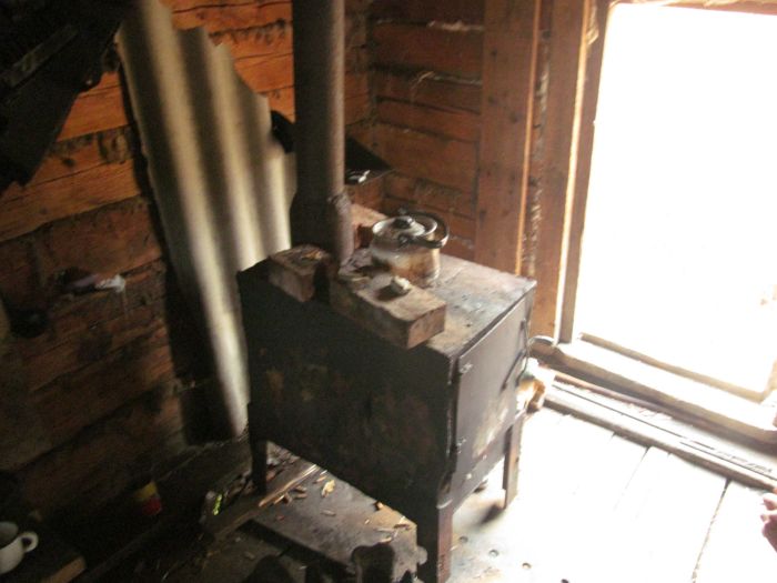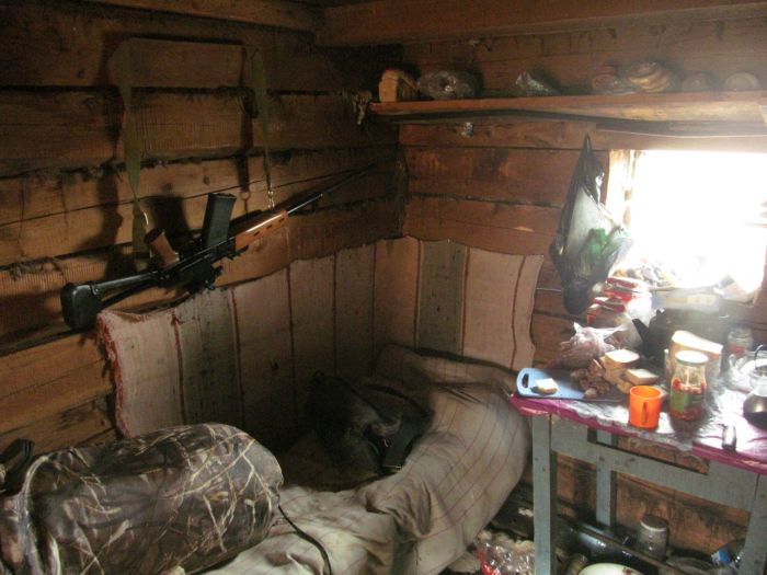 После двух ночёвок в тайге, пройдя почти 100км вверх по течению, нам захотелось маленько обсохнуть и согреться. Прибрежные избушки были заняты местными промысловиками, нашёлся только один домик, распологавшийся в 300м от берега. Хоть одну ночь провели в сухости и тепле. ))) Медведи нас кстати не тревожили - храп двух богатырей и одного сушёного Рембо парализовал нервную систему всех мишек в окресностях. и они разбрелись по тайге с блаженно-глупыми выражениями лица на морде. Лишь один раз видели их след, и совсем свежий след лося.