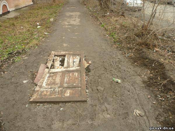 | Открытый колодец закрыли старой дверью |