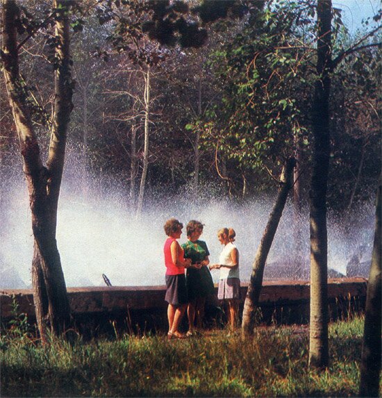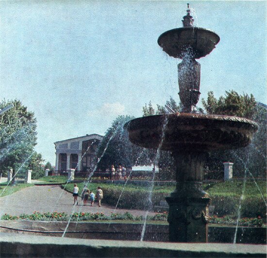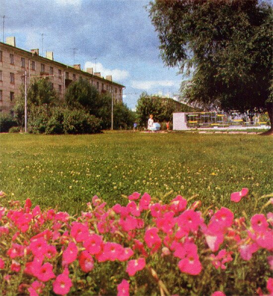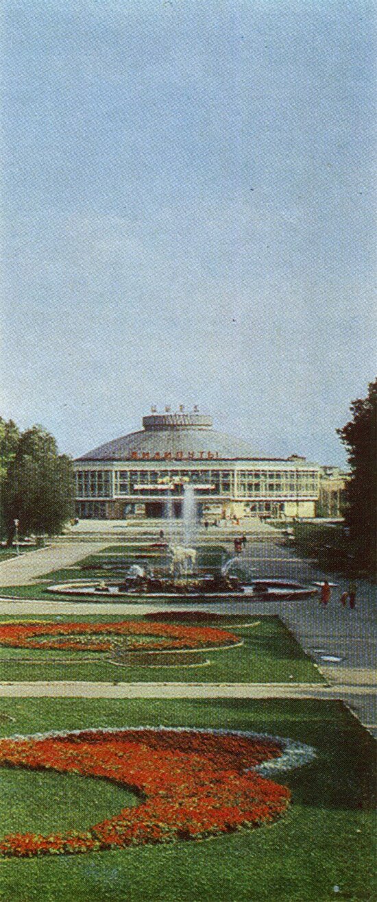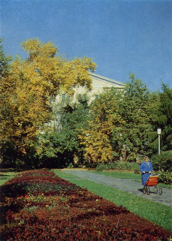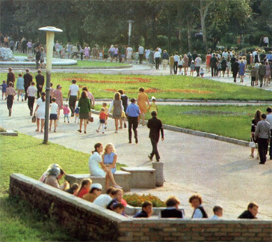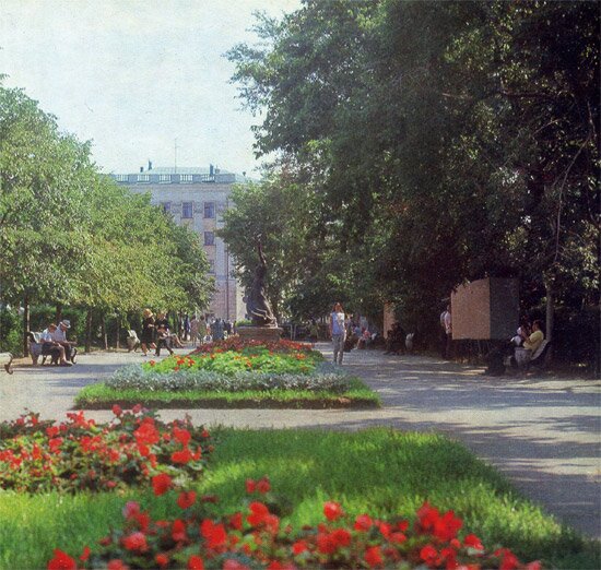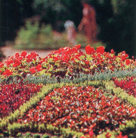 Клумба перед входом в ЦПКиО (со стороны улицы Братиславской). В правой части кадра просматривается забор с декоративными элементами, огораживающий парк с этой стороны. Он просуществовал до начала 90-ых.