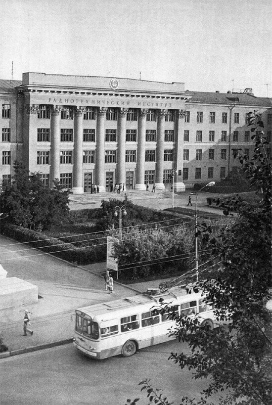 Вид на улицу Гагарина. В правой части кадра виден край правого крыла центрального корпуса Радиоинститута.