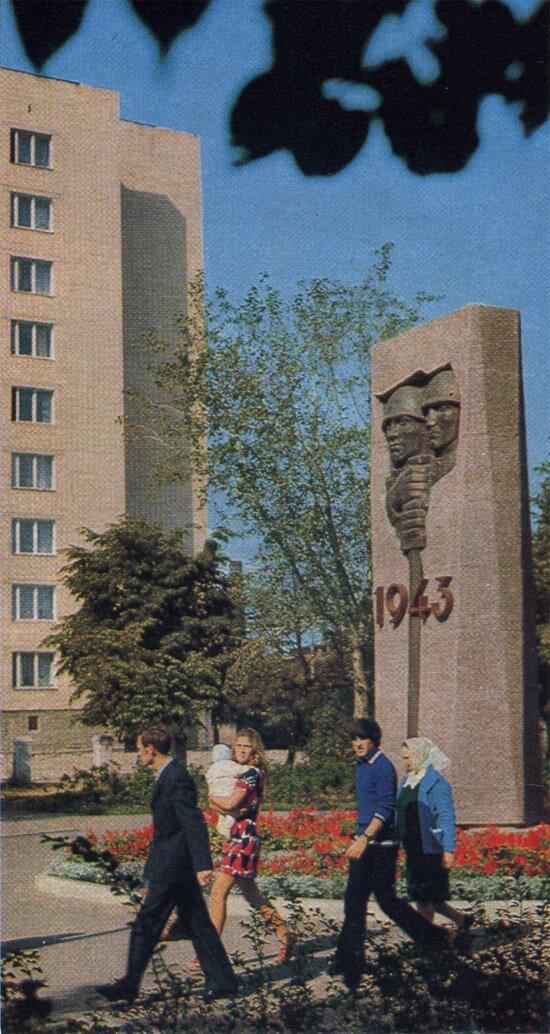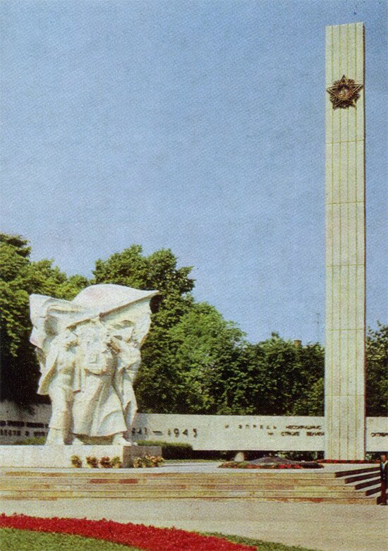 Первомайский проспект. На снимке этого практически не видно (загораживают кроны деревьев), но на мемориальном комплексе рядом с Вечным огнем уже есть скульптурная композиция, установленная в 1975 г.