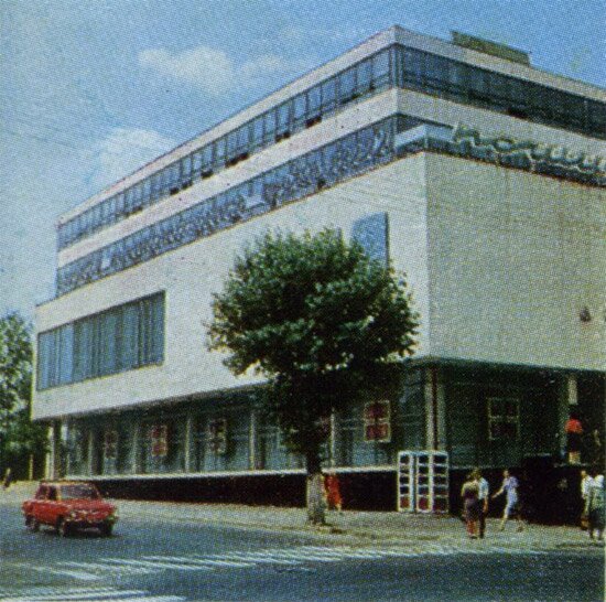 Дом быта. В кадр попали сдвоенные телефонные будки нового образца.