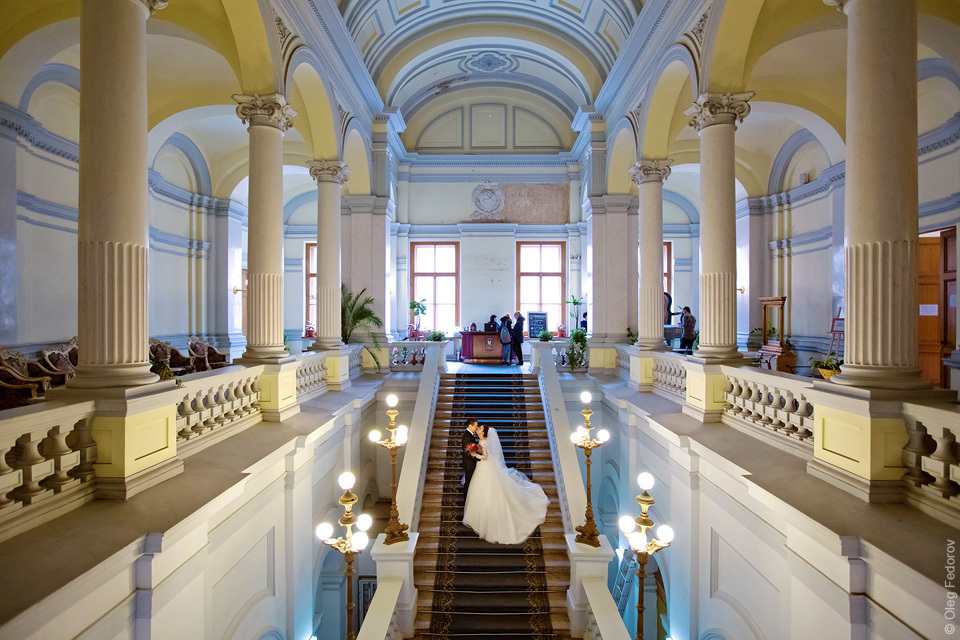 Есть большая шикарная лестница и несколько залов. Заранее договариваться не надо. Практически каждые выходные здесь мероприятия, а значит много посетителей, и фотографироваться будет невозможно. Уточняйте график мероприятий, перед тем, как сюда ехать фотографироваться.