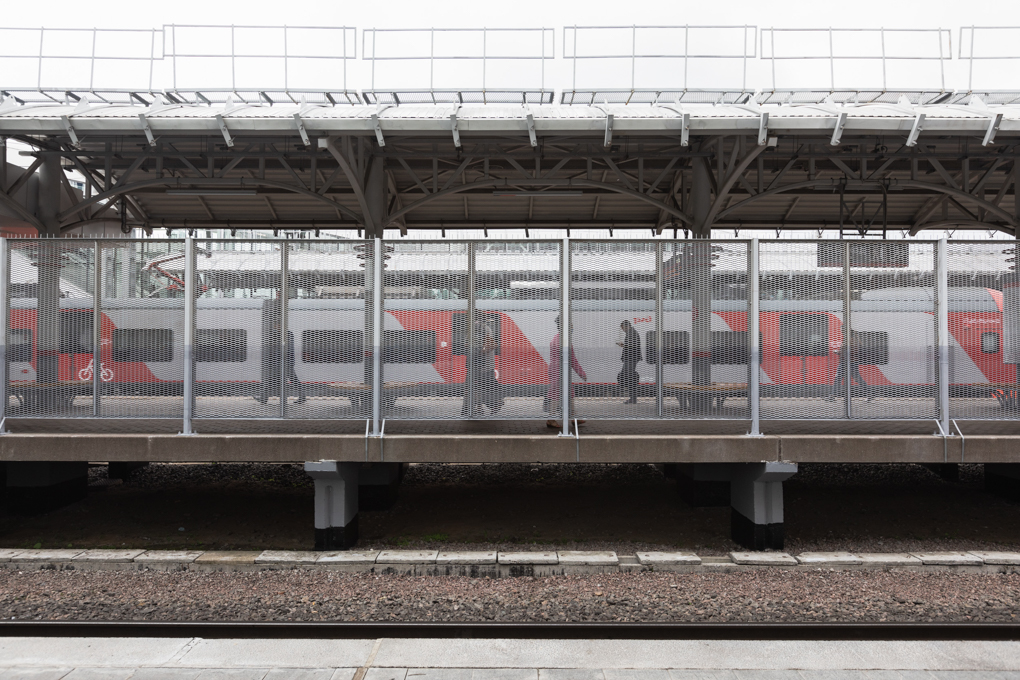 На вокзале островная платформа — как на станции метро. Эскалатор на выход найти не получилось, пришлось подниматься пешком. Я верю, что эскалатор все же есть, просто, видимо, на другом конце платформы, потому что два эскалатора на подъем и спуск по ширине не помещаются рядом.