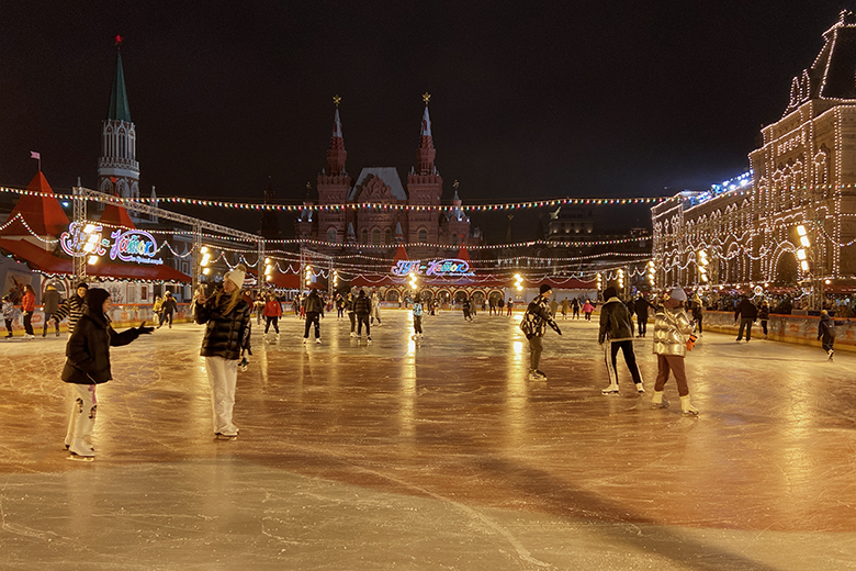 ГУМ-Каток, расположенный в самом центре Москвы в паре метров от ГУМа, на протяжении многих лет остается одним из самых популярных для москвичей и туристов. На площади 2,7 тыс. м 2 свободно размещаются около 500 человек. Сама площадка всегда ярко украшена елками и гирляндами, что заряжает посетителей новогодним настроением. Ну а виды с площадки просто завораживают: Кремль и Собор Василия Блаженного.