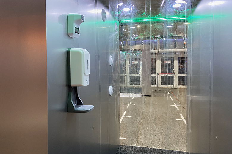 Решила проверить, как оборудован закрытый павильон. Оказалось, там все куда интереснее: на входе стоят обеззараживающие рамки, от которых медленно исходит белый пар, на полу — разметка. Внутри есть кабинки, где можно полить руки санитайзером, самостоятельно измерить температуру. Одна — при входе в павильон, и другая — у выхода на каток. Но попасть в нее можно именно со стороны льда, поясняют сотрудницы ВДНХ.