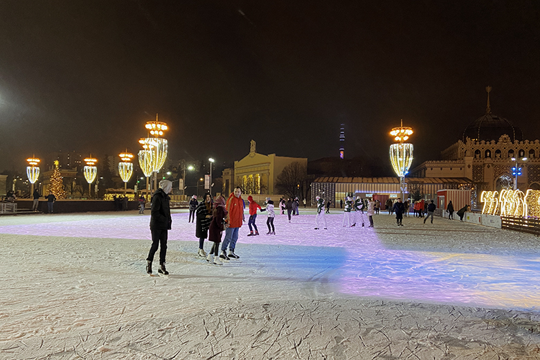 Особенностью ВДНХ является подсветка и декорации. В разных зонах катка создают праздничное настроение разноцветные светящиеся статуи и живописные цветочные поля. Все очень атмосферно и дружелюбно. При необходимости тренеры помогут начинающим встать на коньки, а для самых маленьких есть ледовые помощники в виде забавных зверушек.