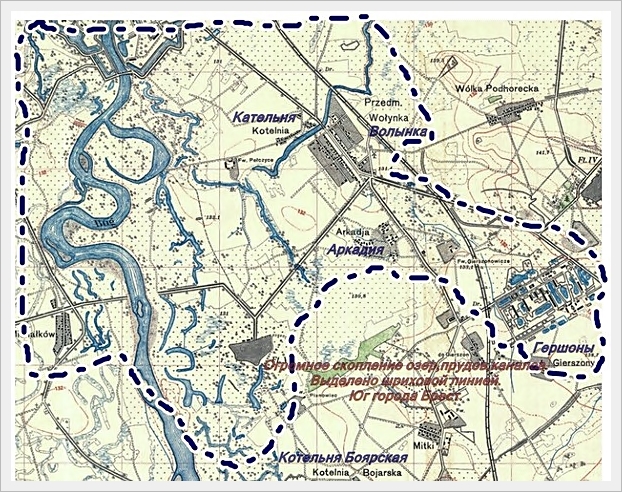 В каждом из приведенных на карте районов города присутствуют естественные и искусственные водоемы. Вот их примерное количество :Волынка- 4 водоема , Ковалево – 10, Восток — 8 , Козловичи — 35 , Вулька — 1 , Красный двор- 14, Вычулки -3, Плоска -14 , Гершоны – 223, Речица – 20, Граевка – 4, Центр – 2, Дубровка- 8, Юго-Западный – 10, Задворцы – 15, Южный- 17, Западный – 3 водоема.Большая часть водоемов расположена на юге города , в районах Волынки и Гершон – 223 водоема. Крупные водоемы (показаны синим цветом) и на польской ( довоенной) карте — юг города Брест :