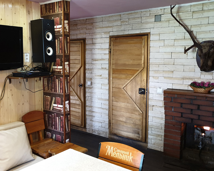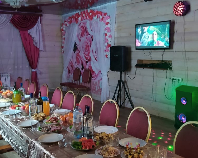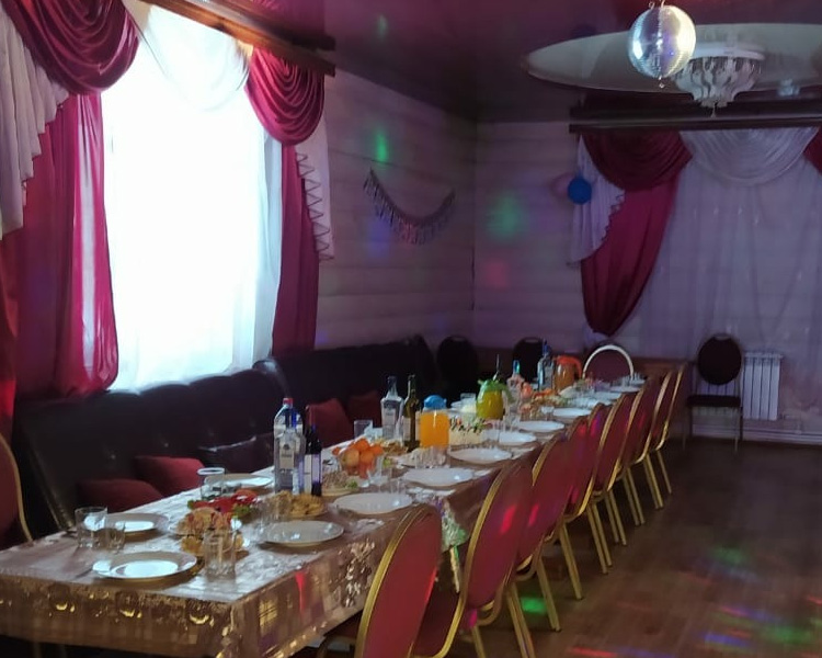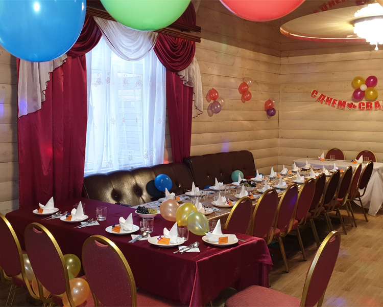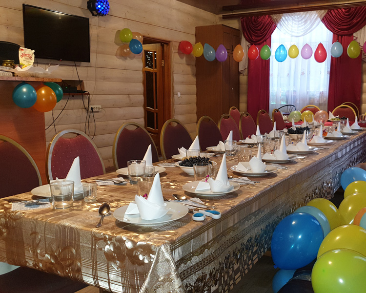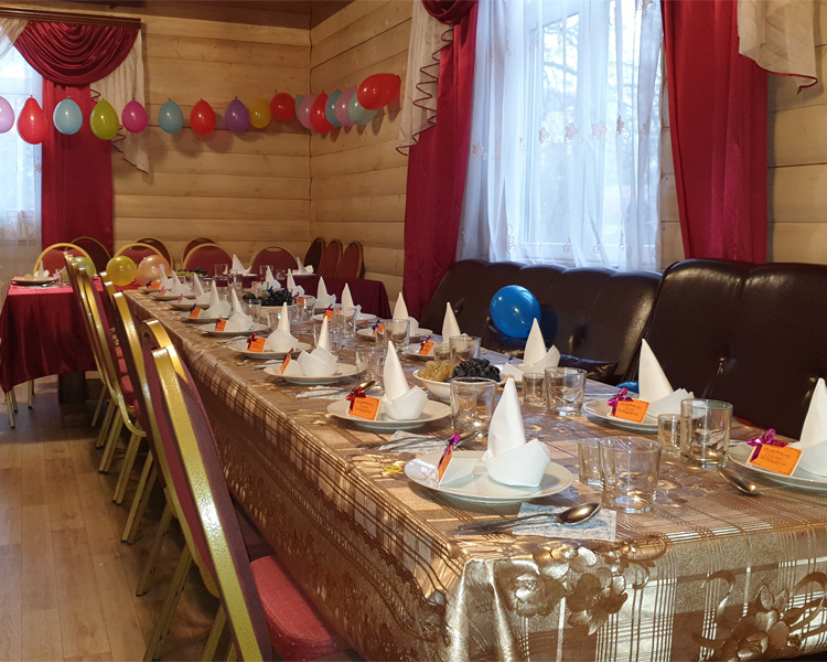 В нашем заведении имеется большой банкетный зал вместительность до 40 человек, в котором можно провести свадьбу, юбилей, день рождения, корпоратив или любое другое торжественное мероприятие. Он находится в отдельном коттедже, где также имеется кухня со всем необходимым и уютные спальни для тех, кто решит остаться у нас после банкета.