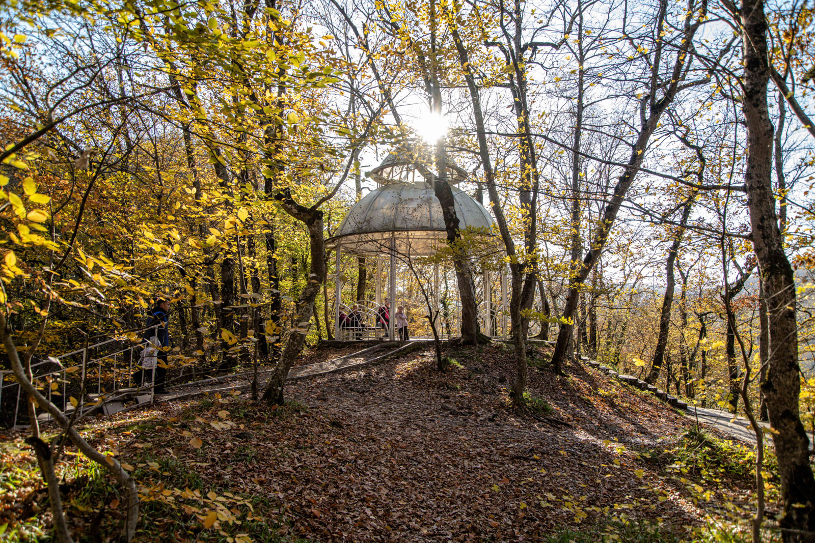 На каждой тропинке расположены указатели, которые помогут не заблудиться. Спуски чередуются с подъемами, есть скамейки и беседки для отдыха. Тропа уходит высоко в гору и заканчивается смотровой площадкой, с которой открывается живописный вид.