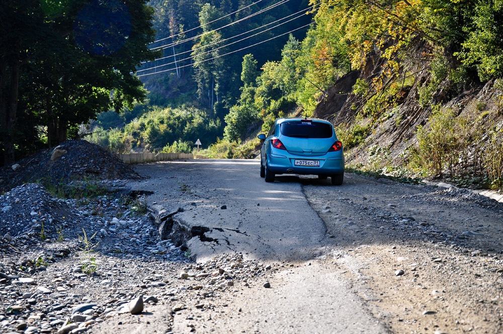 доезжая до пос. Гузерипль надо повернуть направо, там будет такой неприметный поворот, никаких указателей — там начинается самое интересное, так называемая партизанская поляна. Все это мы узнавали у местных жителей. Дорога, сразу скажу, не ахти. Видимо в этих местах часто происходят оползни и селевые потоки, т.к. дорога в некоторых местах просто провалилась в пропасть, вместе с ограждениями. Машин едет крайне мало, не все рискуют. мы рискнули, и не пожалели! Кстати говоря, природа с этой стороны горы меняется кардинальным образом, она становится какой-то жуткой, елки, палки, обрушения, минимум людей и шуршащие кусты…но оно того стоит