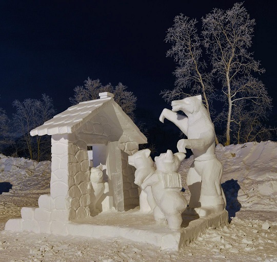 Сооружение со сказочными снежными залами и коридорами определенной тематики. В залах размещаются ледяные скульптуры и снежные экспозиции. Тематика деревни каждый год уникальна.
