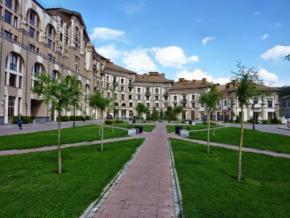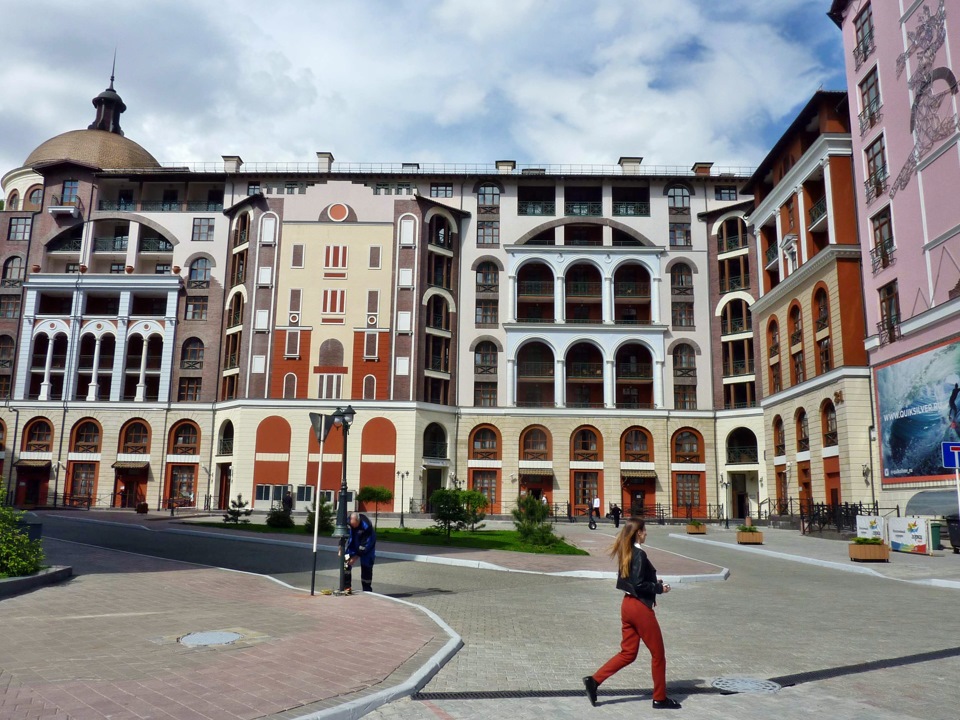 В сентябре - это город-призрак, где почти никого нет. Сказывается удаленность от основной канатки и дешевизна отелей в сентябре в Розе Хутор. Ну действительно, нафиг вам селиться в Горки Город, если можно за такие же деньги взять отель в Розе, где происходит вся движуха? Зато в зимний сезон цены на отели здесь чуть пониже, чем в Розе - поэтому народа тут хватает. А пока - тишина.