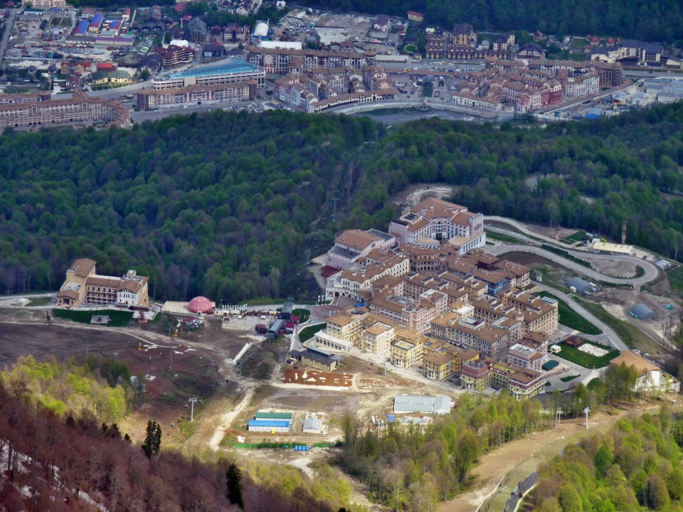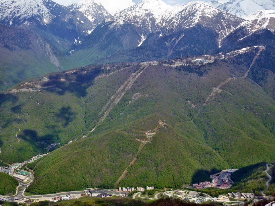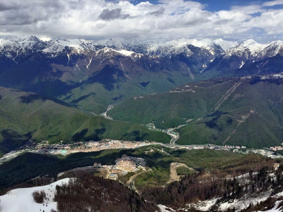 3. А если проехать еще чуть дальше за Горки Город, то вы попадаете в Розу Хутор. Роза Хутор - местная гордость. На ее трассах во время Олимпиады было разыграно 30 комплектов медалей. В общем - это один из основных спортивных объектов Олимпиады. Сейчас это - горнолыжный курорт. Но и в межсезонье здесь есть чем заняться - тут функционируют самые крутые канатные дороги, основная из которых может доставить вас на вершину Роза Пик на высоте 2320 метров. На фотографии ниже представлен общий вид Розы Хутор с подъемника.