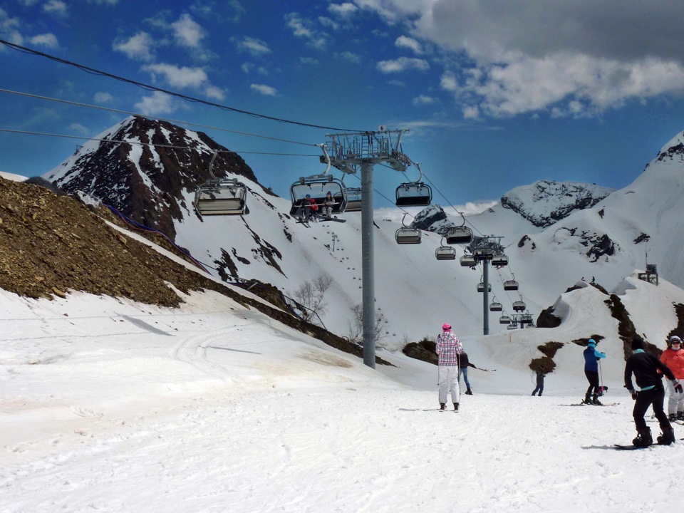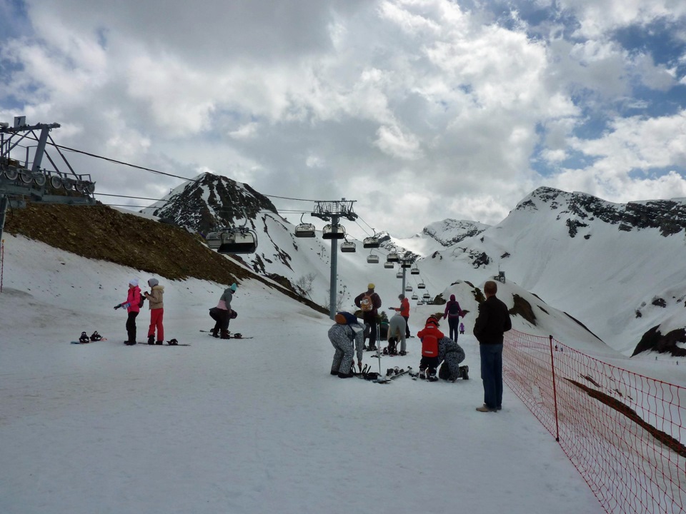 Народ ещё катался, хоть снег на вершине уже и был оооочень тяжёлый. Кстати в конце апреля, ГГ включает бесплатно прокат оборудования в цену скипаса.