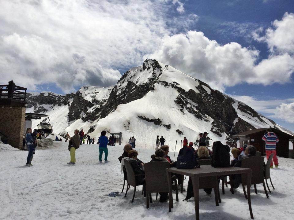 На конечной станции можно позагорать, покататься на ещё открытом склоне, посидеть в кафе, или попить растворимого кофе за 4 цены из палатки