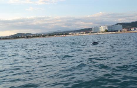 в имеретинской бухте в Сочи в мае было полно дельфинов, за яхтой плыли