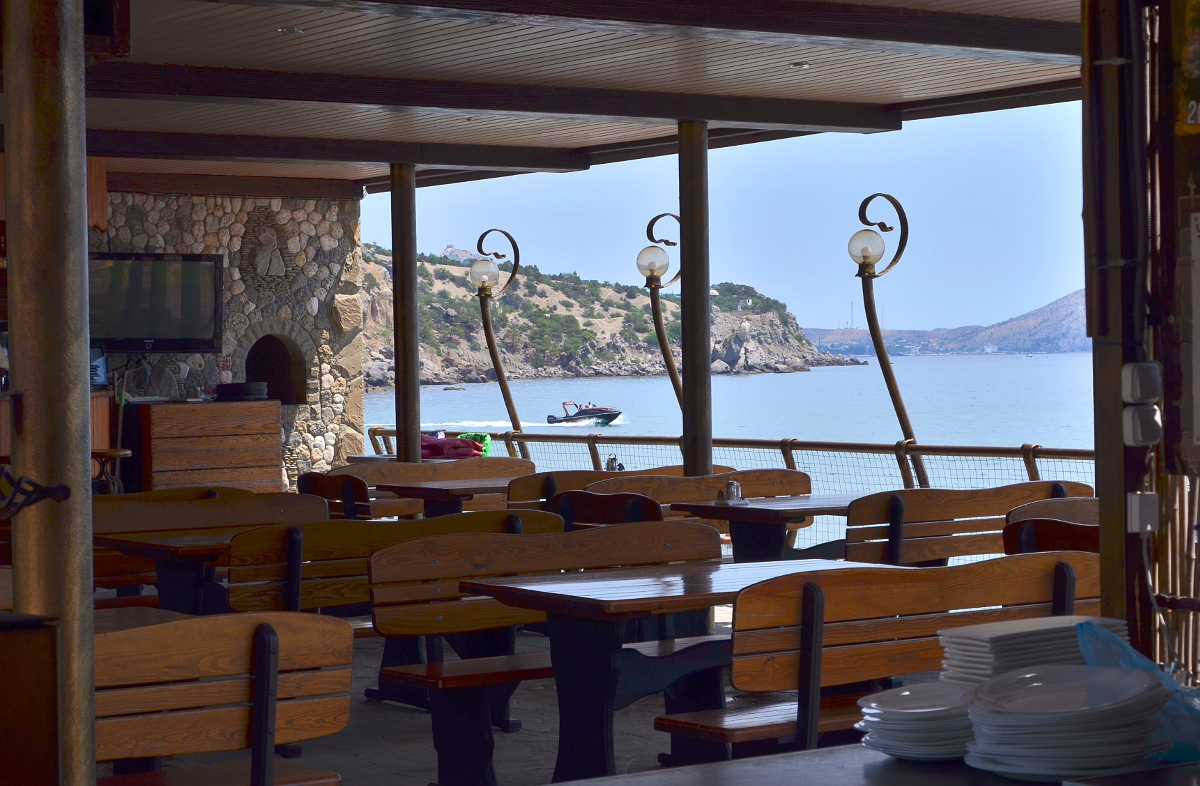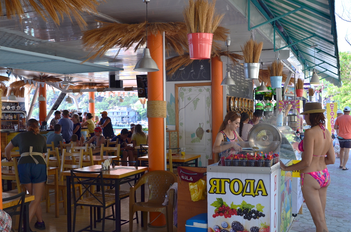 Кафе ждёт отдыхающих, но до обеда все предпочитают толпиться на пляже.