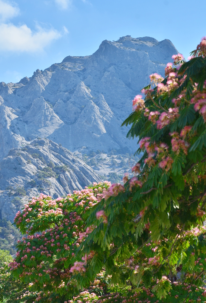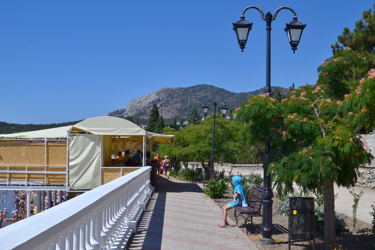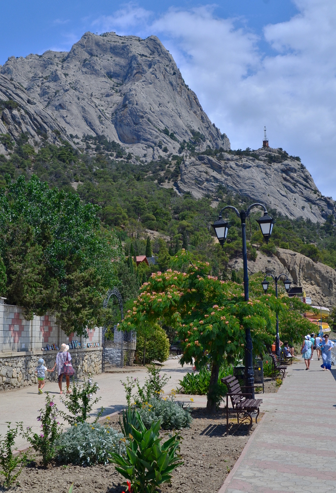 Набережная Нового Света намного меньше в ширину, чем судакская, но зато, более зелёная! Деревья дают тень, спасение от солнцепёка, а между ними густо посажены цветы. Это вам не три прутика и трава-бурьян, как в Судаке, эх.