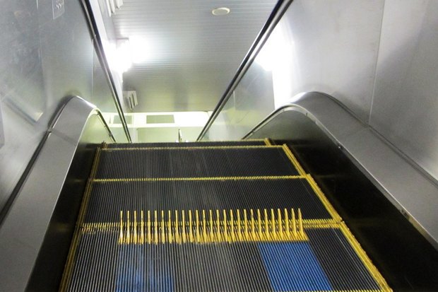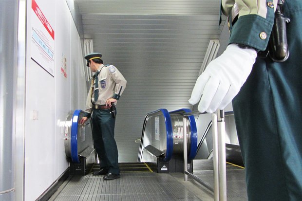 Чтобы пассажир на колёсах случайно не скатился, у края временной площадки автоматически выдвигаются блокирующие упоры. Для того чтобы перевести эскалатор в такой режим, нужна помощь сотрудника метрополитена, а само лестничное полотно необходимо остановить на несколько секунд. Возможно поэтому чаще всего маломобильные токийцы предпочитают спускаться в метро с помощью лифта.