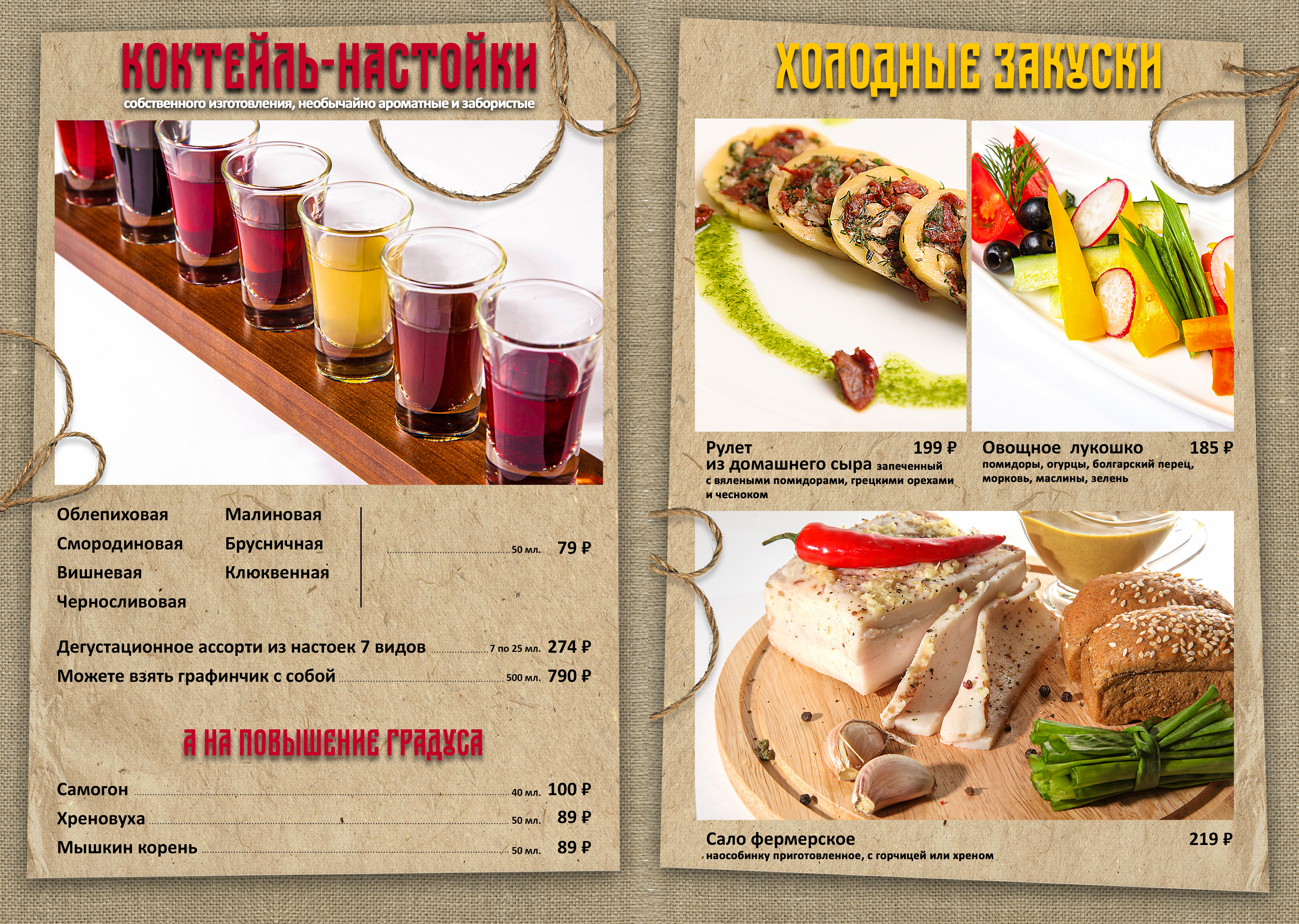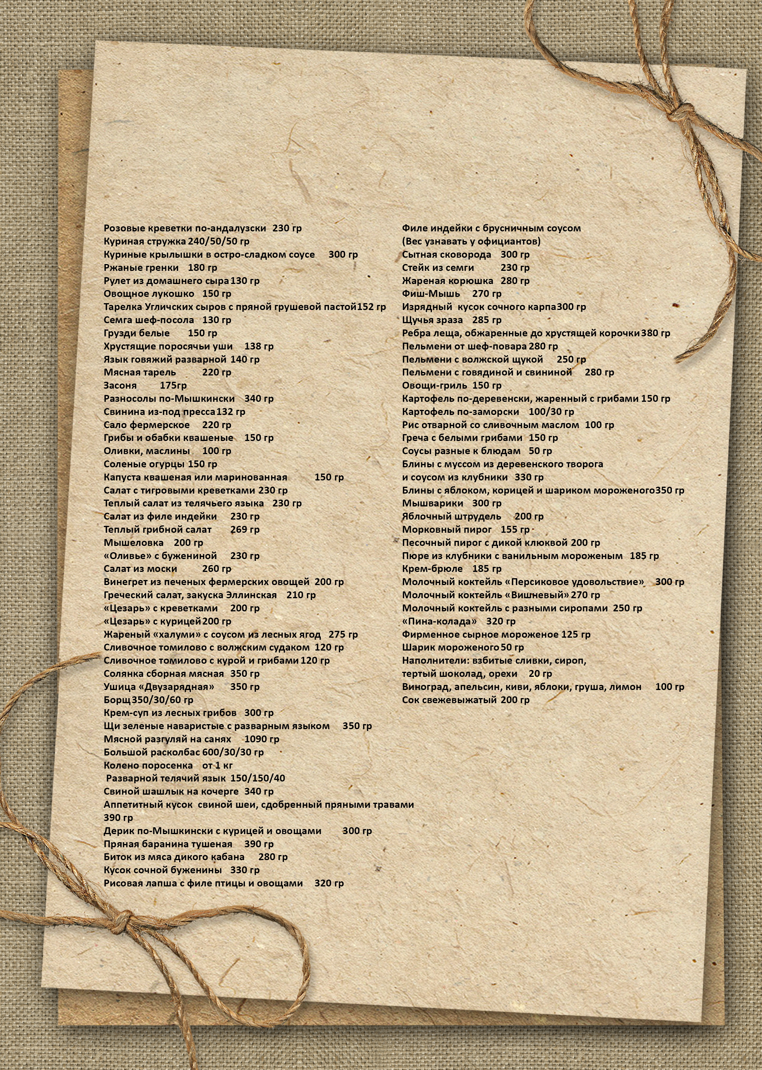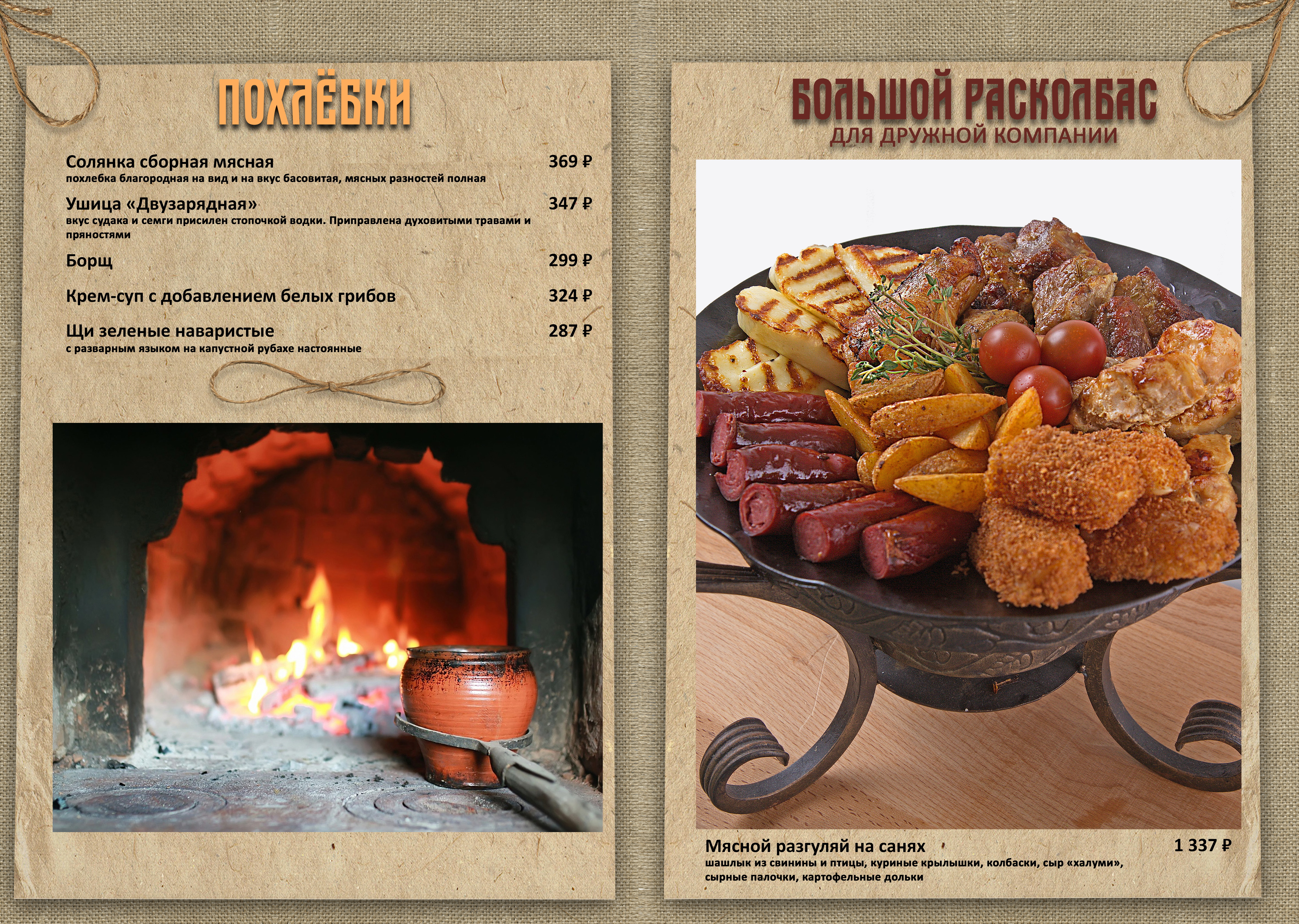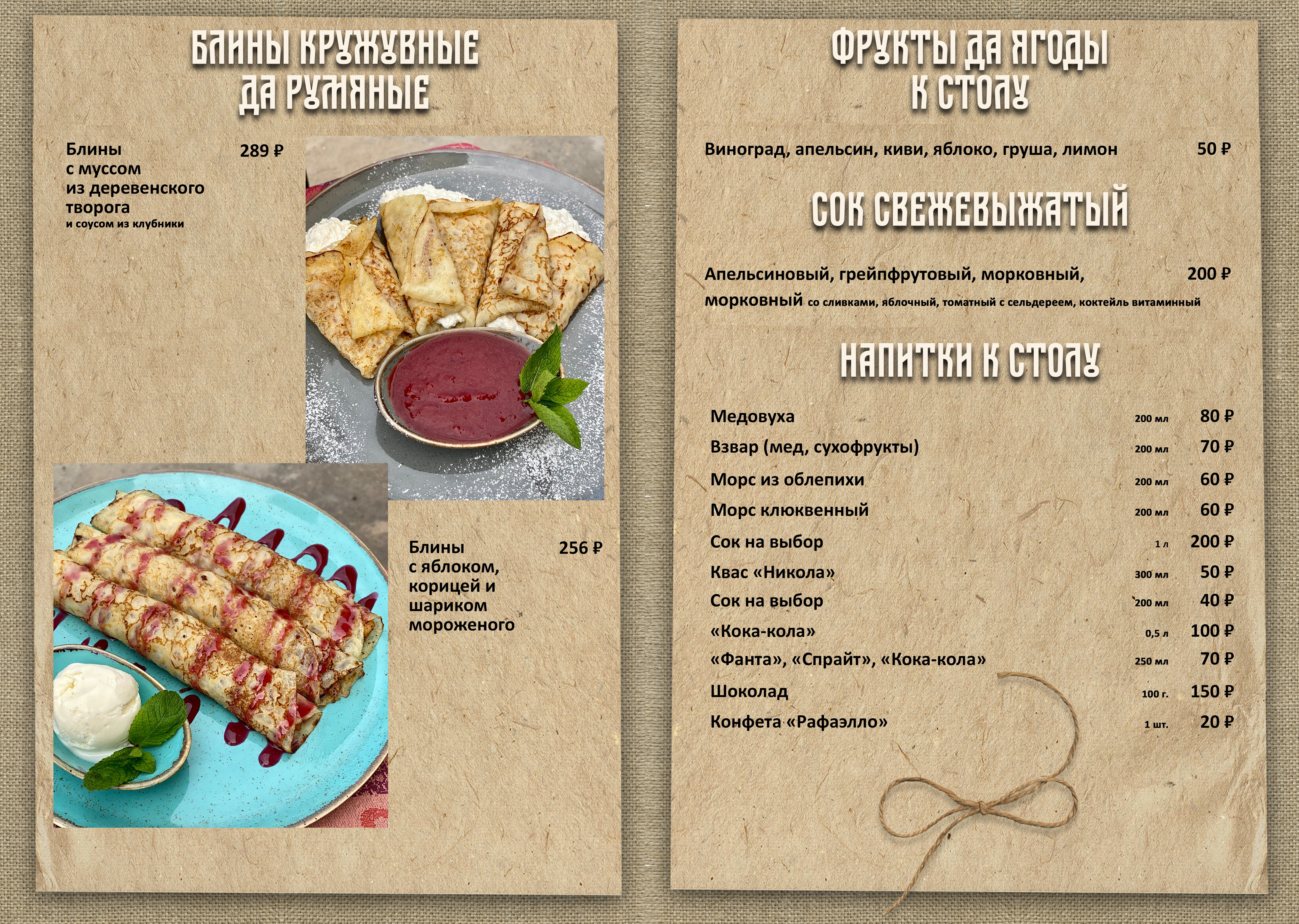 Далее – подлинное великолепие: деревянная мебель, официанты в народных костюмах, кухонная утварь и витражи на окнах, подлинный самогонный аппарат в одноименном зале – “Самогонный”. В меню блюда традиционной русской кухни, деревенская еда.