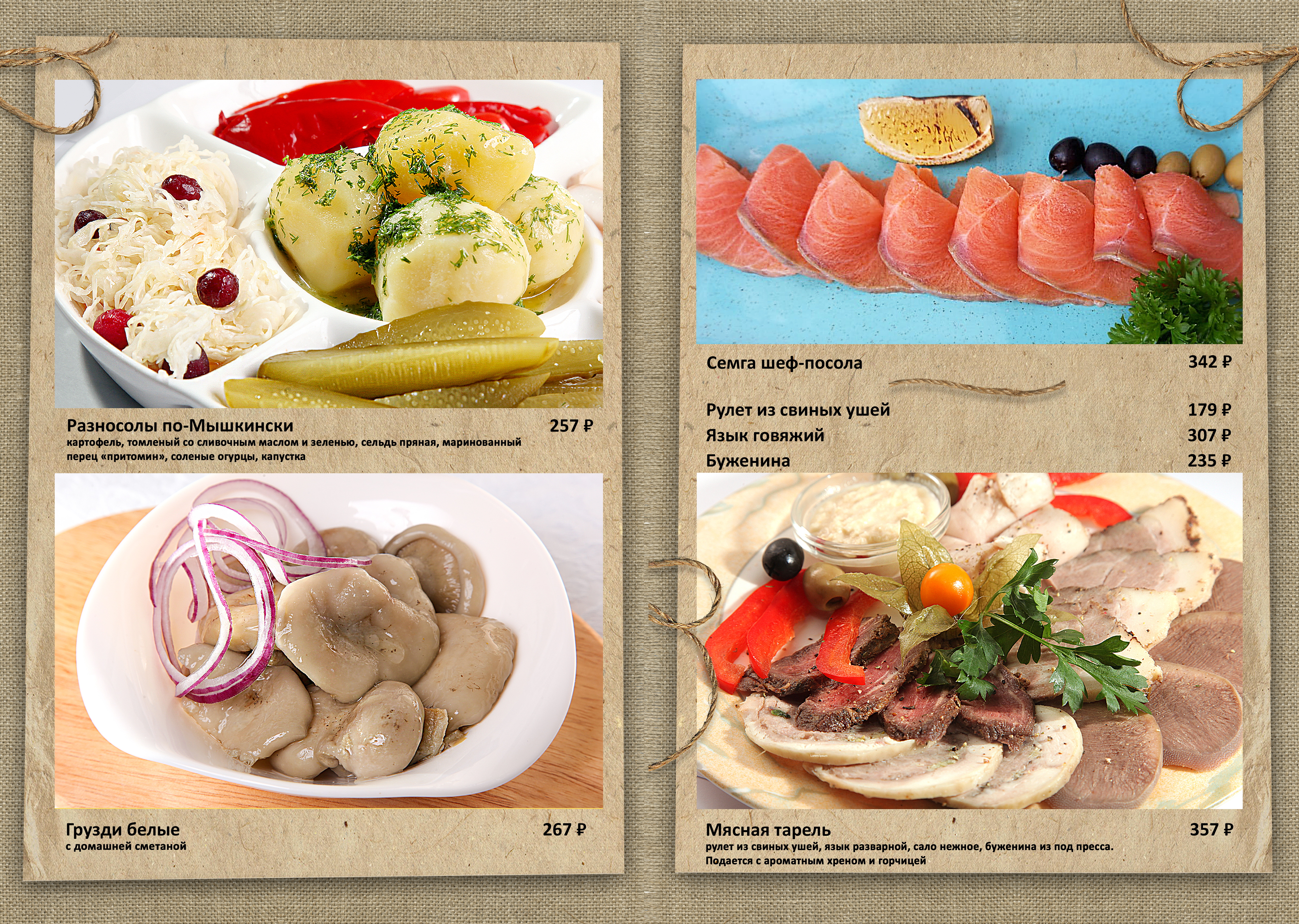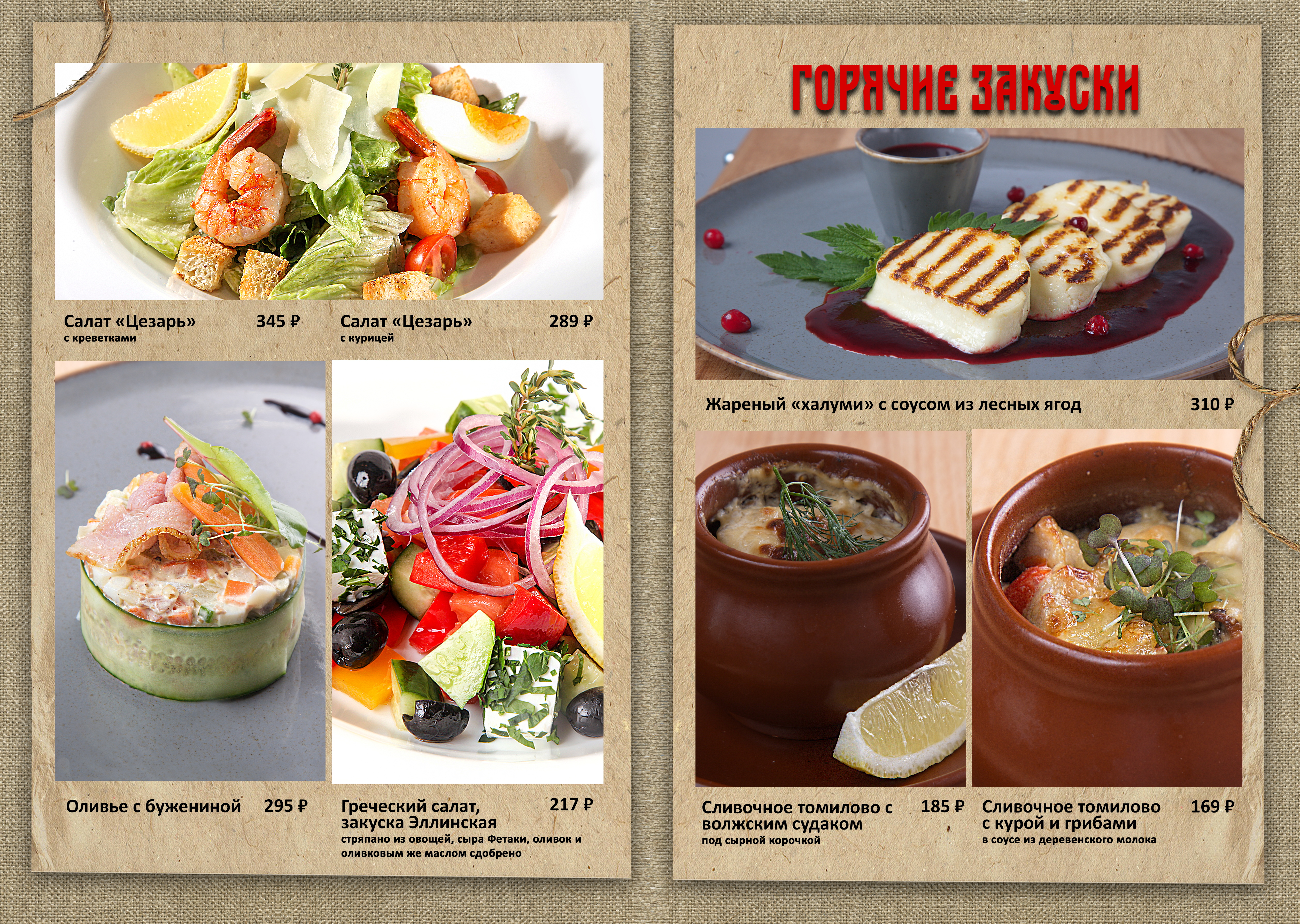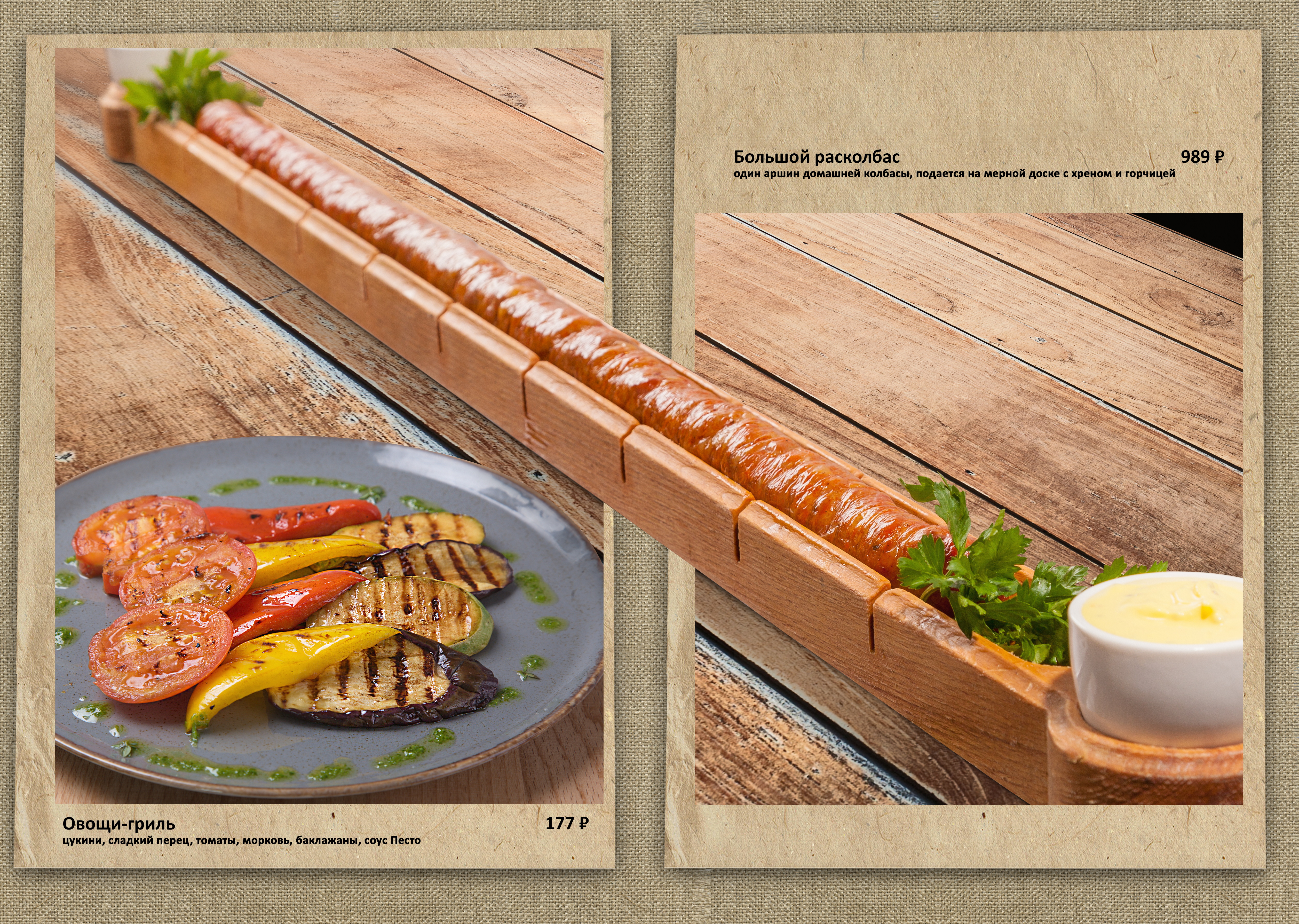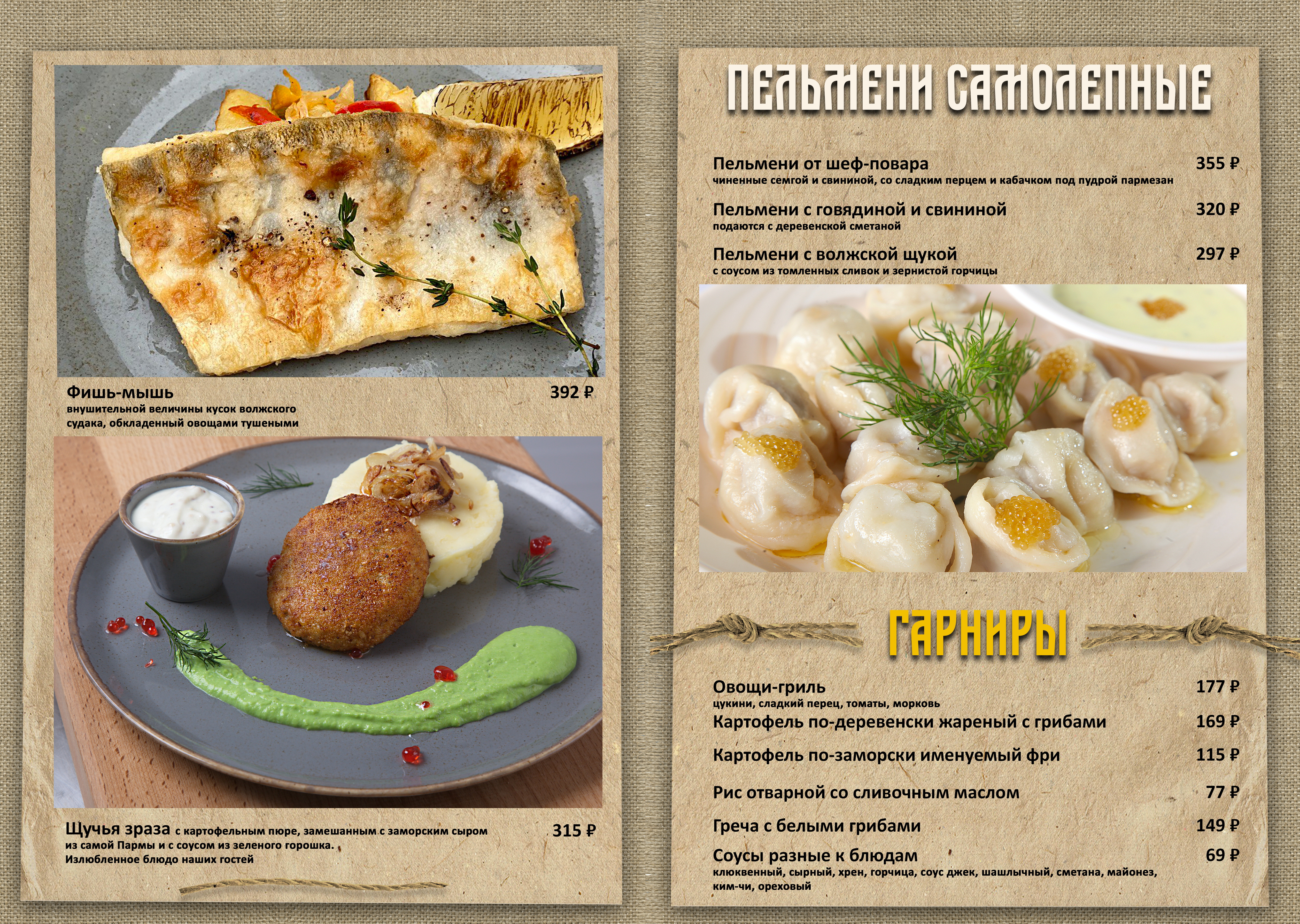 Далее – подлинное великолепие: деревянная мебель, официанты в народных костюмах, кухонная утварь и витражи на окнах, подлинный самогонный аппарат в одноименном зале – “Самогонный”. В меню блюда традиционной русской кухни, деревенская еда.