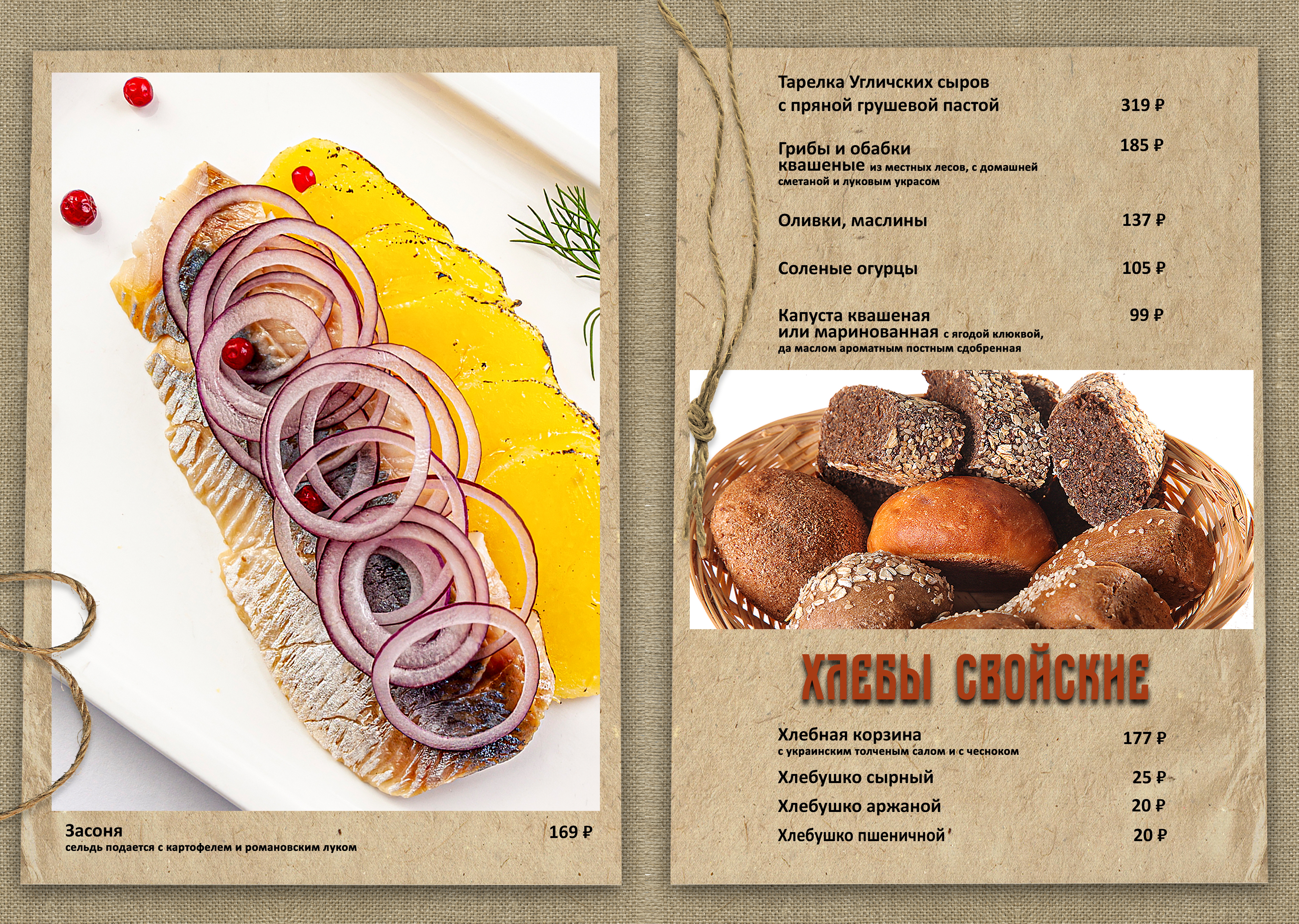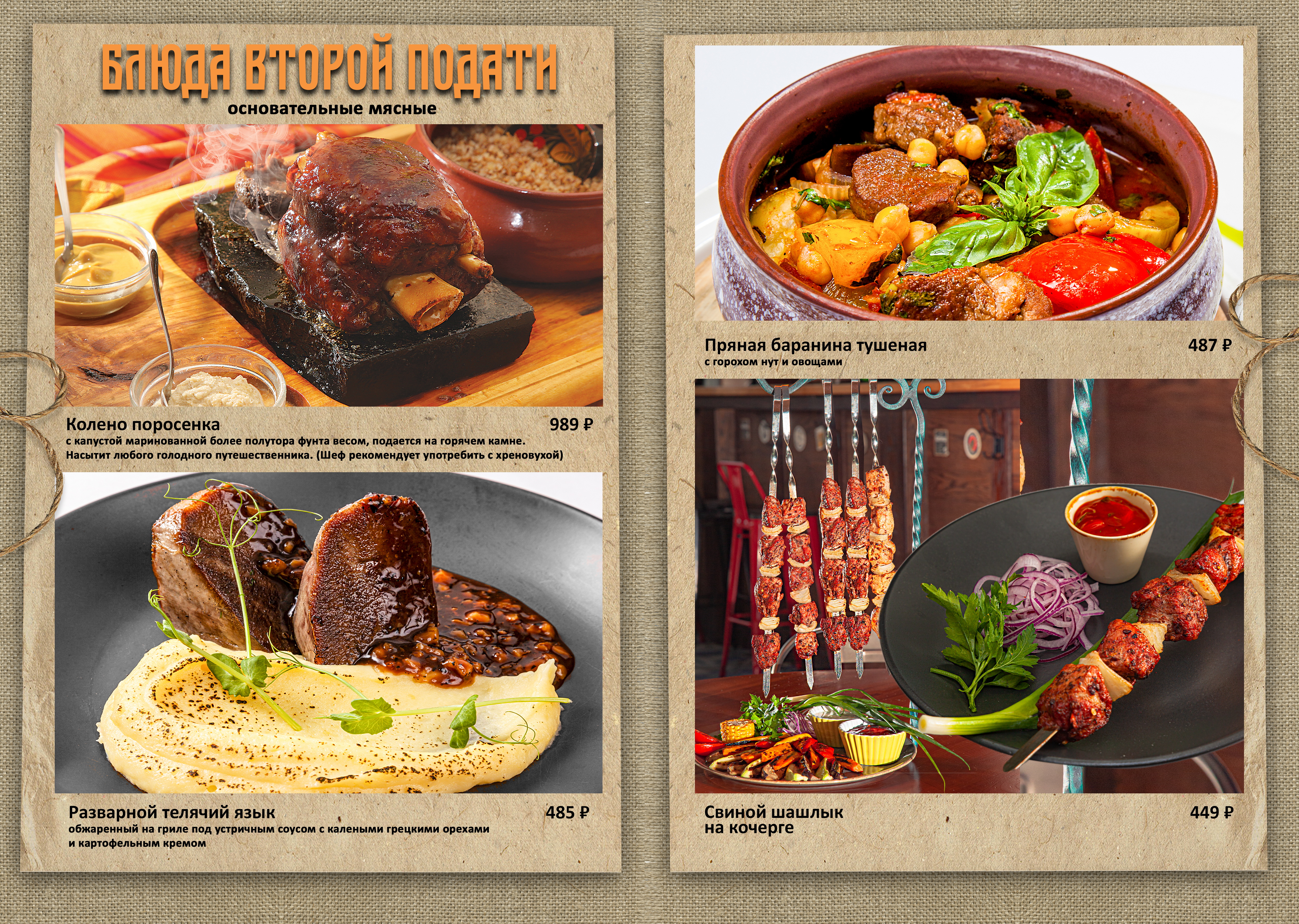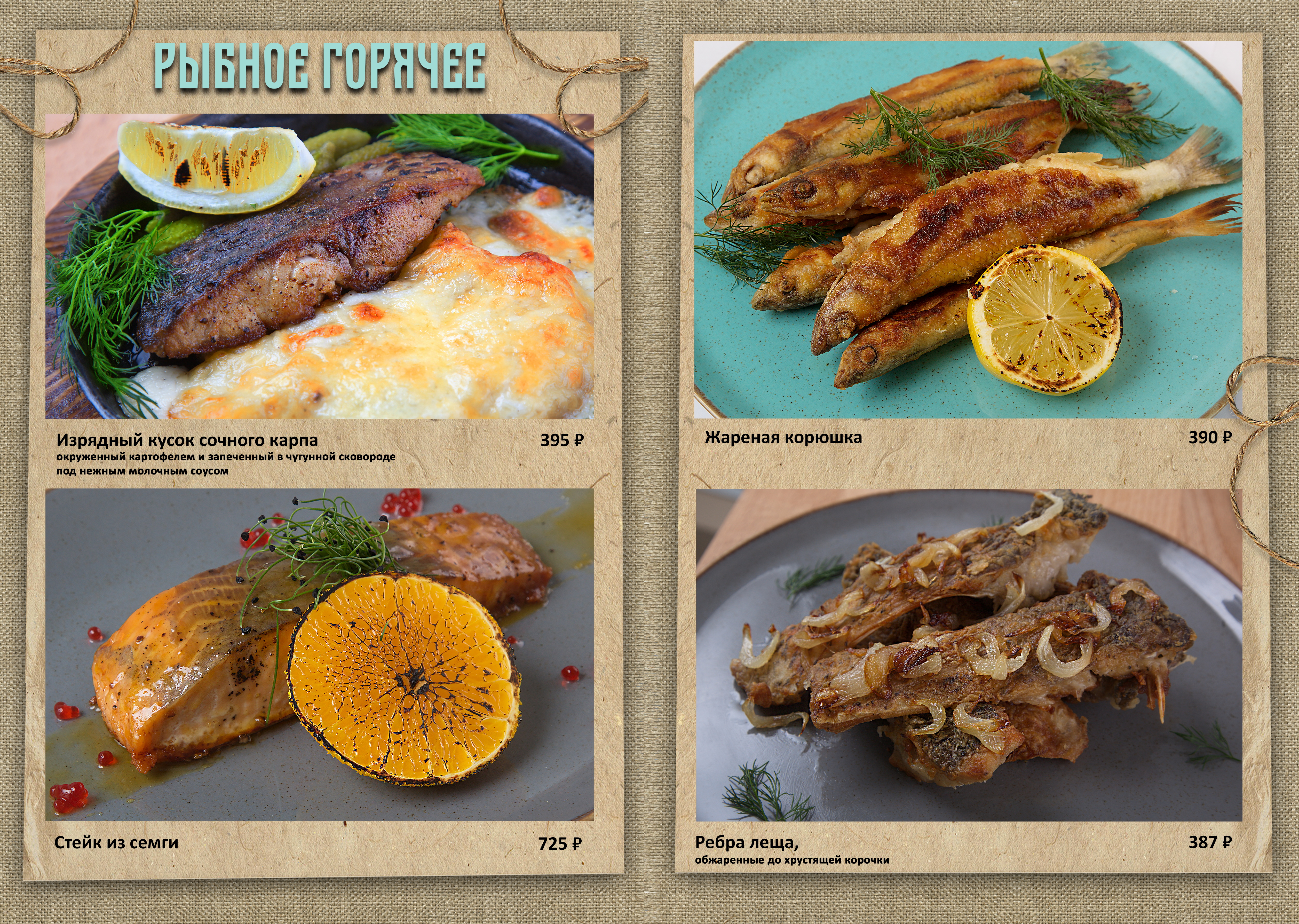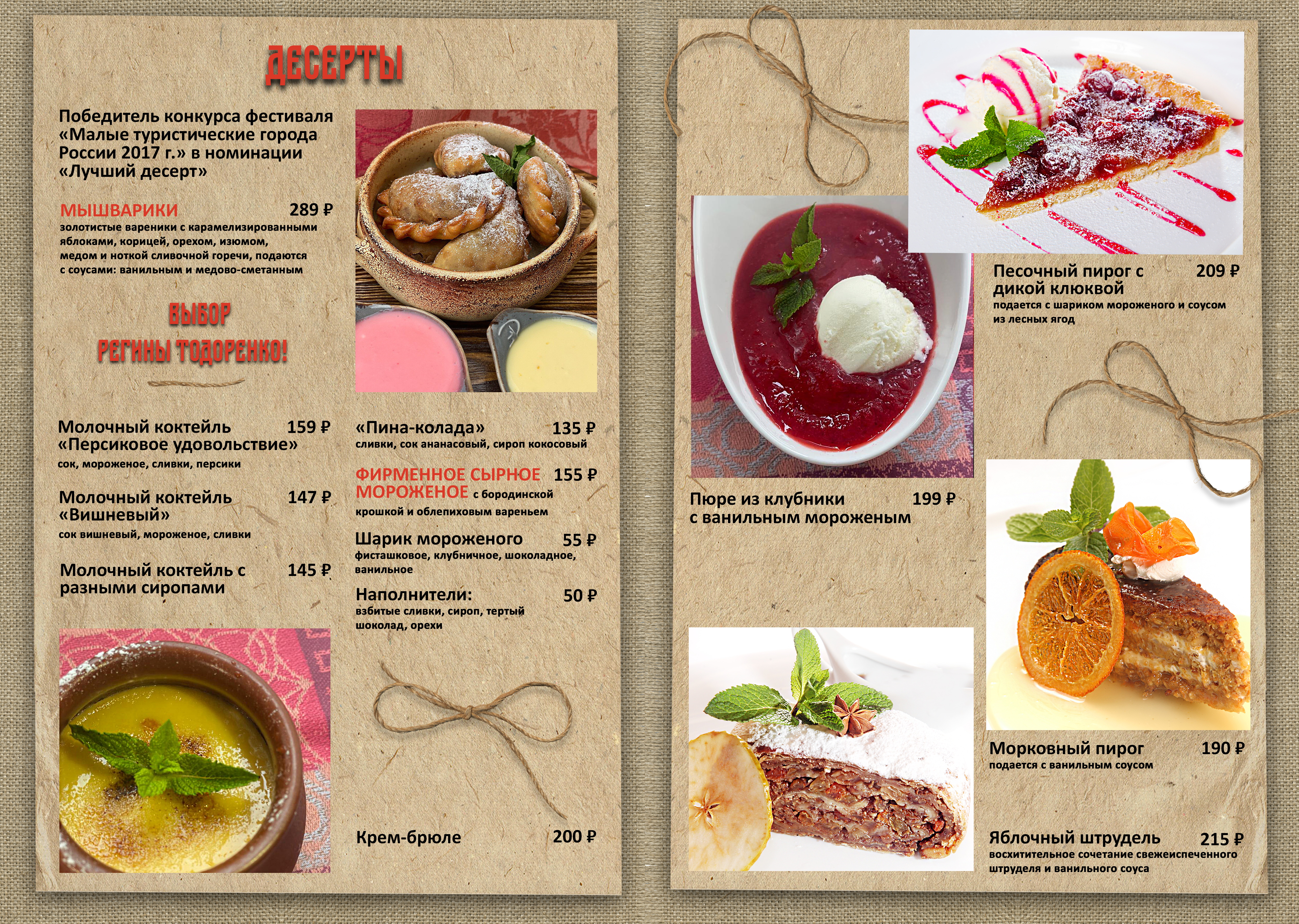 Далее – подлинное великолепие: деревянная мебель, официанты в народных костюмах, кухонная утварь и витражи на окнах, подлинный самогонный аппарат в одноименном зале – “Самогонный”. В меню блюда традиционной русской кухни, деревенская еда.