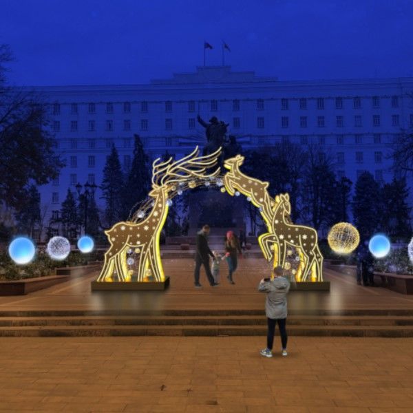 К новогодним праздникам Ростов будет украшен более, чем двадцатью композициями. На площади Советов будет установлена светящаяся арка из трех оленей. Возле здания Музыкального театра появится упряжка с лошадьми, выполнить которую планируют из фигурно постриженной травы.