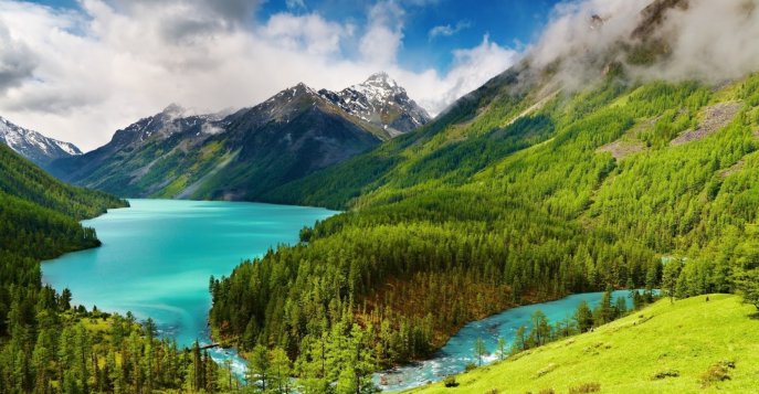 Алтайские горы — это 19 хребтов, которые расположены на территории России, Казахстана, Монголии и Китая. Российское предгорье находится в Алтайском крае, преимущественно степной зоне, а основная часть — это Горный Алтай. Его отличает жаркое короткое лето и морозная зима, характерные для континентального климата — впрочем, для Сибири календарная зима считается теплой. Благодаря такому ландшафту здесь сочетаются различные климатические зоны: в одном путешествии можно в течение нескольких дней увидеть и сочные зеленые луга в долинах рек, и заснеженные вершины, и тайгу с устремленными ввысь кедрами, и высокогорную тундру. Ясных дней здесь столько же, как и в Сочи. Выбрать лучшее время для отдыха сложно — каждый сезон хорош по-своему.