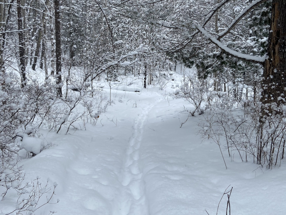 Пока шли по колее — снега было по щиколотку. А как свернули на тропинку — то и вовсе по колено. Благо, он лёгкий и пушистый. И нет особого набора высоты.