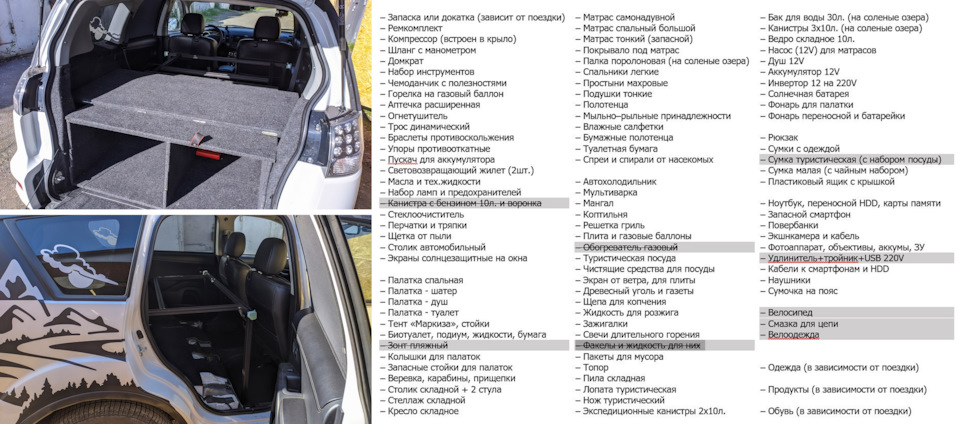 Установил спальник на всякий случай — это если вдруг приедем поздно или в ураганный ветер. Да и на обратной дороге мы планировали заночевать на берегу Обского моря и разбивать палатку не планировали. Ну а список уже был готов, он у меня универсальный — вычеркиваю ненужное, а потом ставлю плюсик против того, что приготовил и обвожу кружком то, что погрузил в машину. Очень эффективный способ — трудно что-то забыть 📋