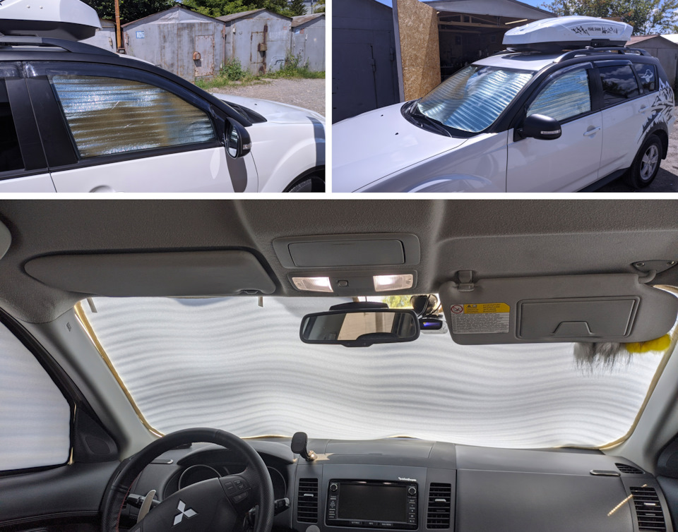 Из не совсем удачных прибамбасов хочу остановиться на шторках от солнца. На озере они выполнили свою роль на 100% — салон реально не нагревался, да и плюс сетки на стеклах задних дверей помогали. Но делал я их с целью защитить наш сон от ранних утренних лучей, если мы ночуем в машине, а они оказались прозрачными почти ☀ Так что нужна будет доработка! Крепятся элементарно: боковые поджимаются стеклами, а лобовое тремя зубочистками )))