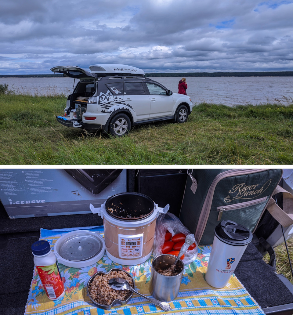 🍲 Вторая остановка — обед на Обском. Одно из наших любимых мест, прохождение которого как раз совпадает по времени с желанием пообедать ))) Останавливаемся на берегу между Кирзой и переправой в Спирино. В Ярково притормозили — засыпали в мультиварку гречку, масло, сосиски и воду, а по приезду к месту обед был уже готов!